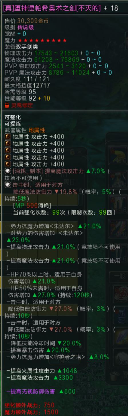 【95真堕神涅帕希奥术大剑不灭的】+18-9x,3300满魔攻,全服唯一在售