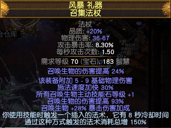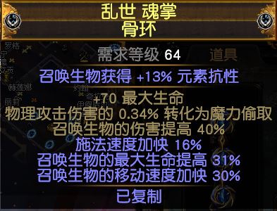 召唤等级+T2召唤伤害+召唤暴伤+自动施法召集法杖,召唤伤害+召唤生命+生命+抗性盾牌,召唤极品戒指一对,新版+4灵体+2召唤等级头盔,极品双尊崇衣服手套鞋子,双大型星团珠宝套,要塞誓约珠宝,满级满品质强辅,带全部珠宝技能石药剂,1106召唤物伤害,6200血盾,满混沌抗性,满元素抗性,超高物理减伤84%,真实满75%攻击格挡和满75%法术格挡,在召唤灵体电蜘蛛极强清图的输出的情况下拉满生存能力