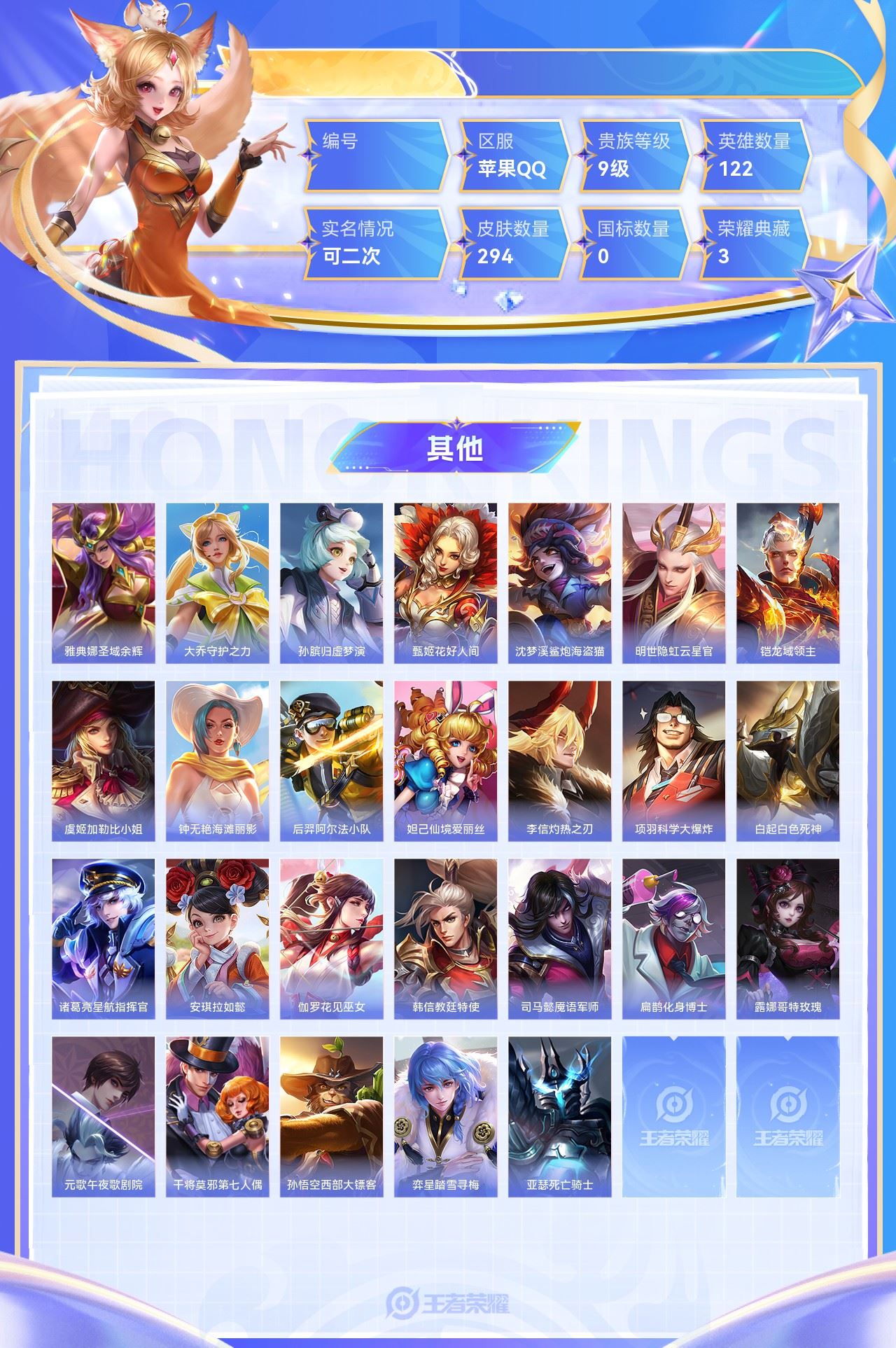 【终身找回包赔】【64TKXHGC2】稀有英雄1典藏3传说16史诗88限定94英雄122皮肤294贵族9级皮肤价值:251708 【稀有英雄1】_武则天 【荣耀典藏3】花木兰九霄神辉武则天倪克斯神谕夏