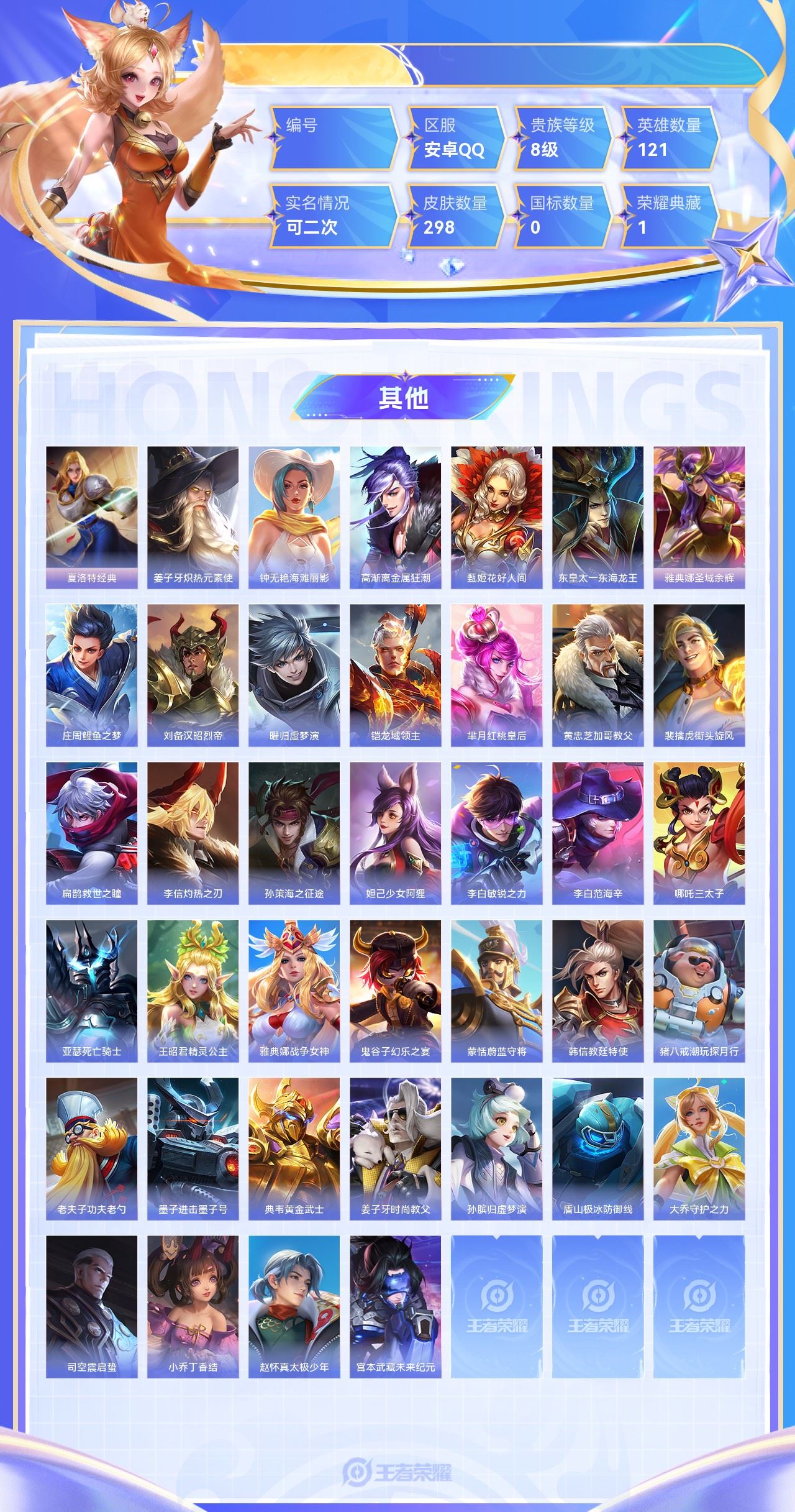 【终身找回包赔】【69ZQTA22E】珍品传说1典藏1传说25史诗93限定105英雄121皮肤298贵族8级皮肤价值:231790 【珍品传说1】嫦娥器灵落星盏 【荣耀典藏1】李白鸣剑曳影 【传说皮肤