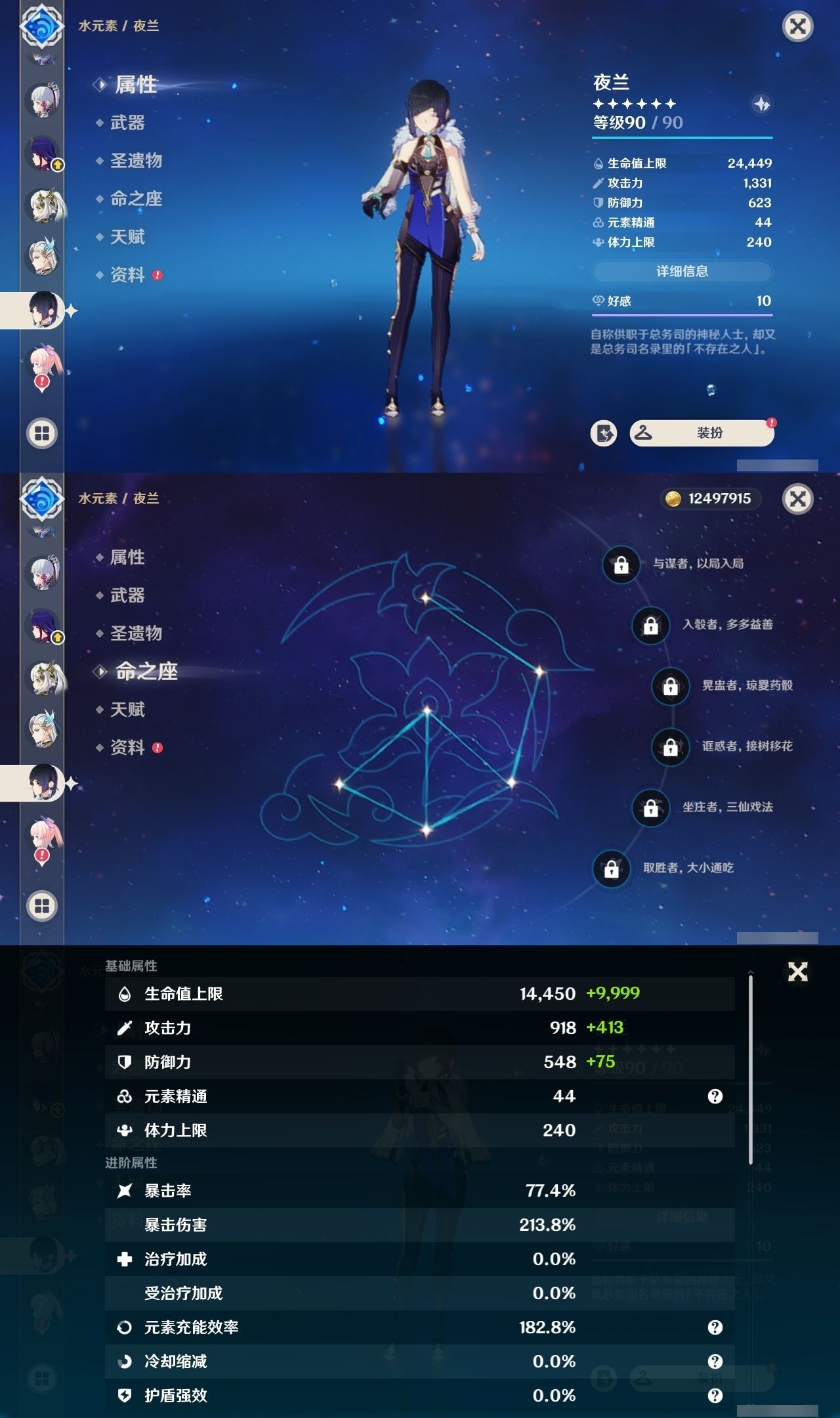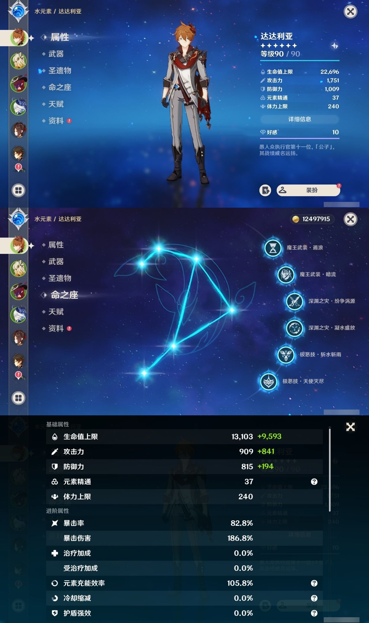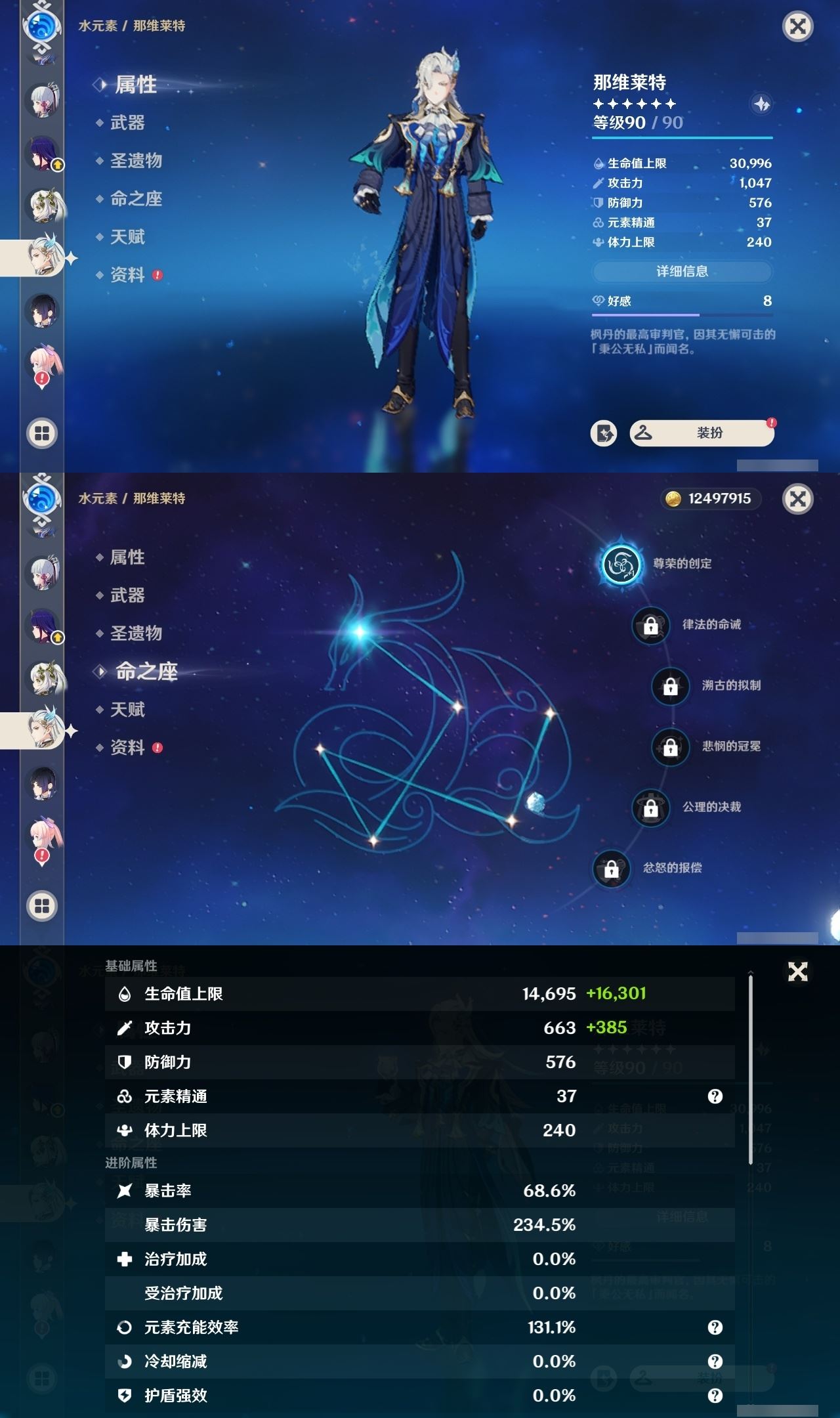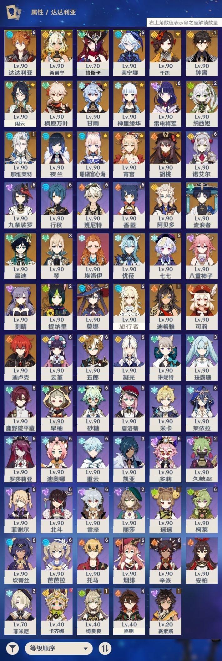 【终身找回包赔】【IQOMNECA2】60级,95黄,女主,30个五星角色:满命达达利亚,满命芙宁娜,满命雷电将军,5命七七,5命莫娜,3命琴,2命纳西妲,2命提纳里,1命钟离,1命那维莱特,1命迪希
