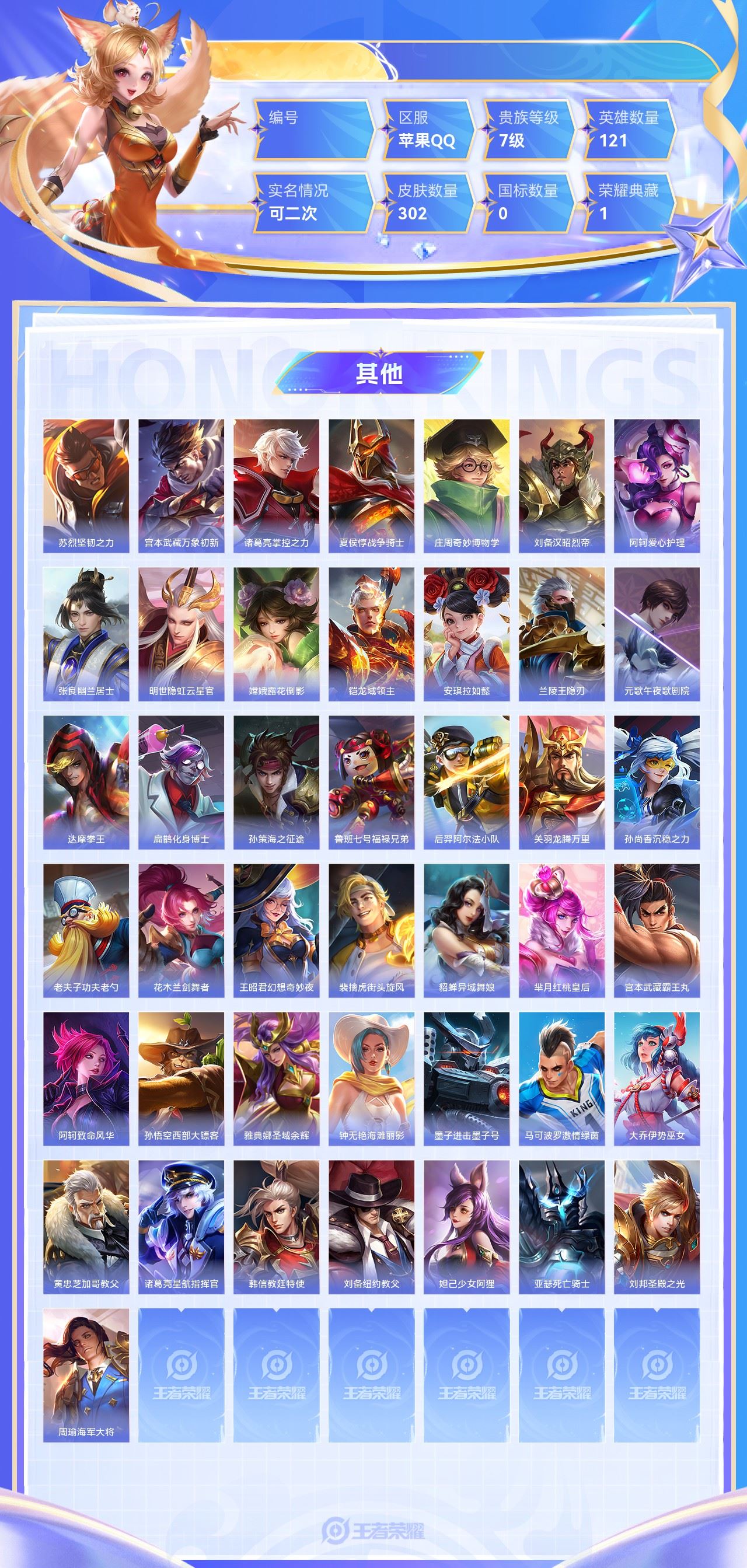 【终身找回包赔】【6ZRZSBFF1】典藏1传说13史诗81限定118英雄121皮肤302贵族7级皮肤价值:212518 【荣耀典藏1】铠银白咏叹调 【传说皮肤13】桑启鸣野蒿孙策乘龙淬吴钩孙尚香乘龙