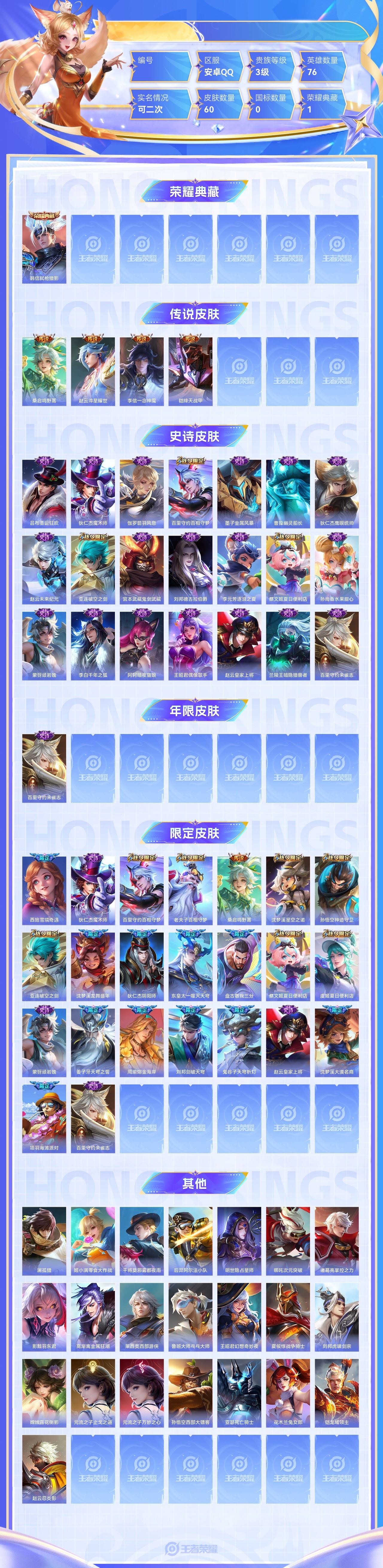 【终身找回包赔】【6X3TRAG1A】典藏1传说4史诗21限定23英雄76皮肤60贵族3级皮肤价值:62692 【荣耀典藏1】韩信弑枪猎影 【传说皮肤4】桑启鸣野蒿赵云淬星耀世李信一念神魔铠绛天战甲