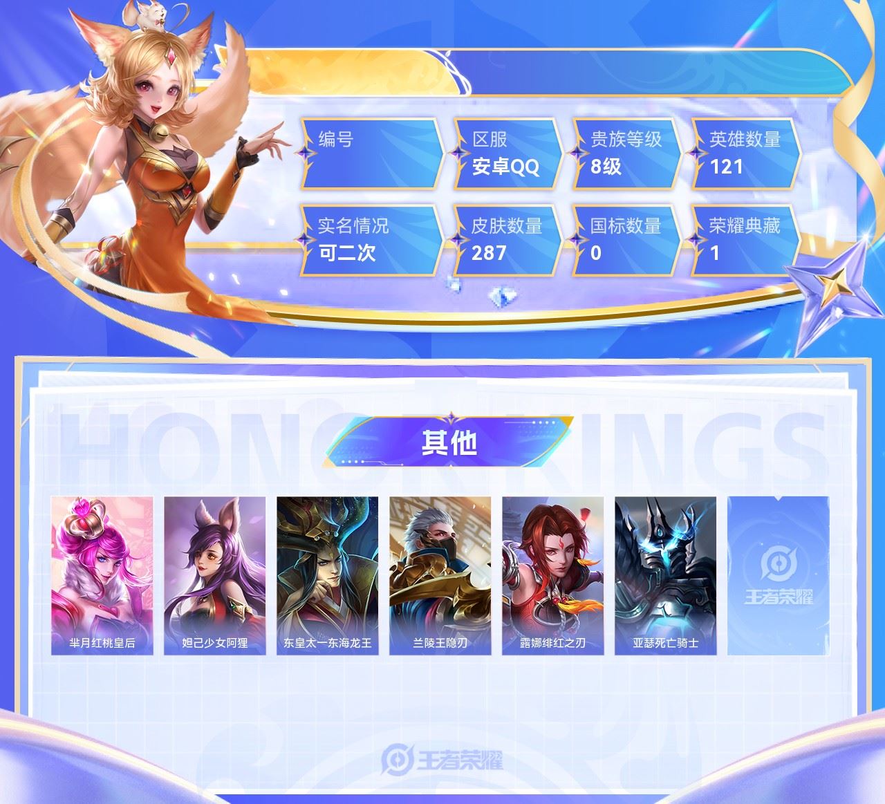【终身找回包赔】【6TTX512HF】典藏1传说15史诗74限定89英雄121皮肤287贵族8级皮肤价值:197304 【荣耀典藏1】诸葛亮星域神启 【传说皮肤15】澜愿照九州拓云缨幻光神枪桑启鸣野蒿