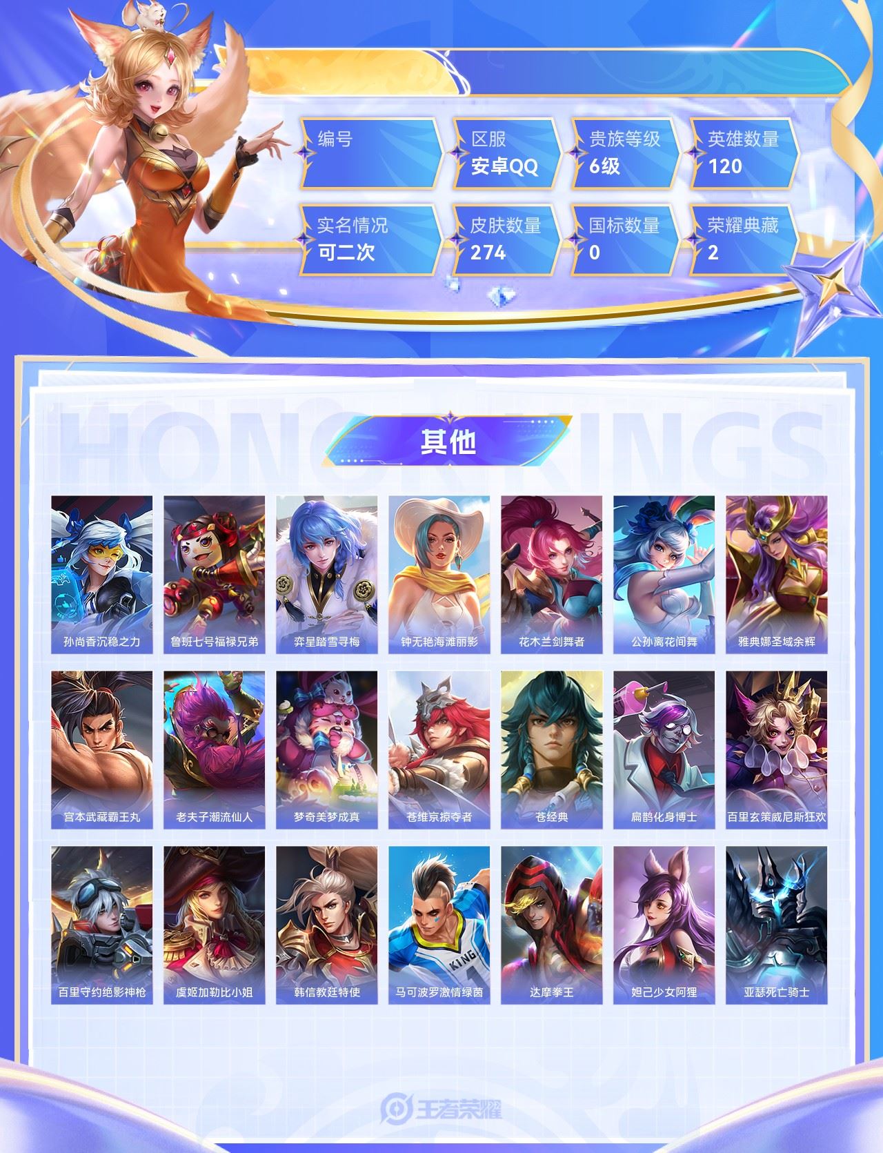 【终身找回包赔】【69R8V22CG】典藏2传说22史诗74限定104英雄120皮肤274稀有英雄1贵族6级皮肤价值:220544 【荣耀典藏2】花木兰九霄神辉鲁班七号星空梦想 【传说皮肤22】桑启鸣