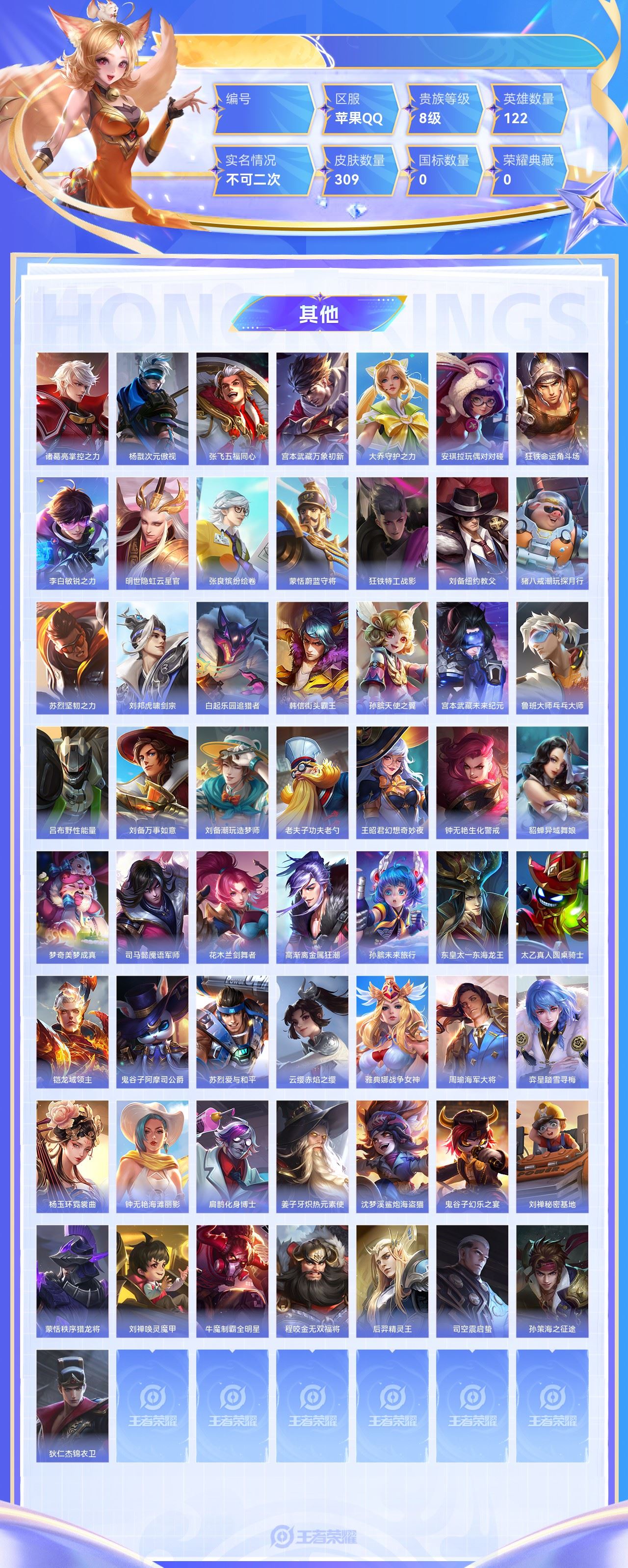 【终身找回包赔】【64TKXHACB】珍品传说2无双4传说31史诗77限定100英雄122皮肤309贵族8级皮肤价值:215212 【珍品传说2】嫦娥器灵落星盏孙策时之奇旅 【无双皮肤4】小乔时之魔女