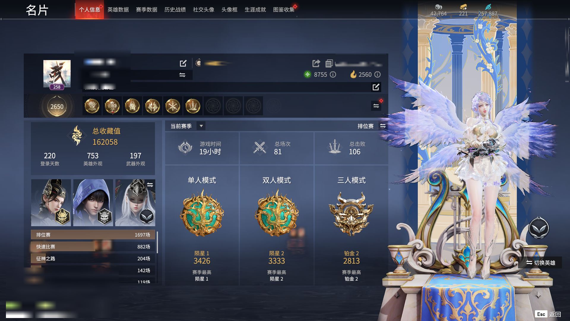 【终身找回包赔】【I0V4LA11G】5红289金|等级258|铂金2813|幻丝257887|金砖221|通行证Lv.189红色神品:沙漠香风,逐光者,天罚,少阳剑,帝星角色金色皮肤:开辟鸿蒙·山川