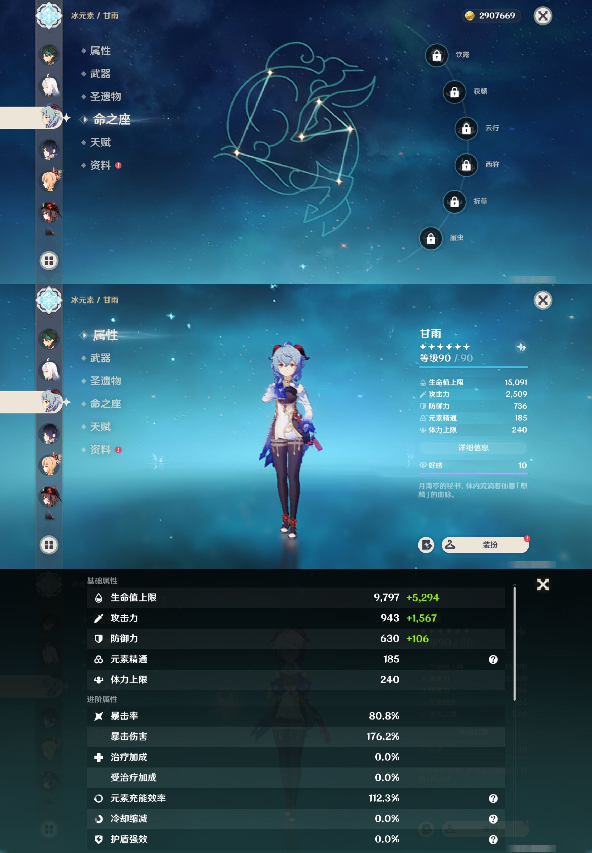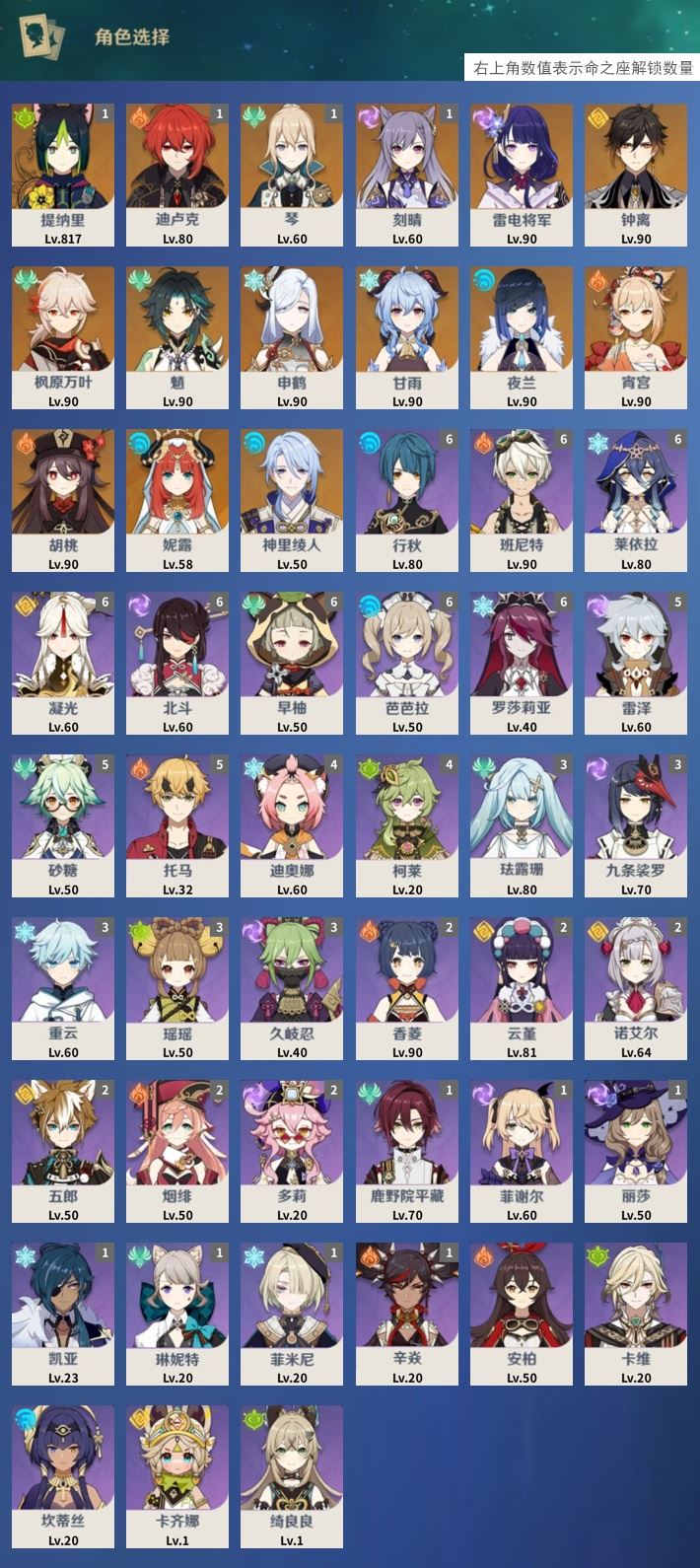 【终身找回包赔】【I0V4L2FEH】58级,24黄,女主,15个五星角色:1命提纳里,1命迪卢克,1命琴,1命刻晴,雷电将军,钟离,枫原万叶,魈,申鹤,甘雨,夜兰,宵宫,胡桃,妮露,神里绫人,5个五