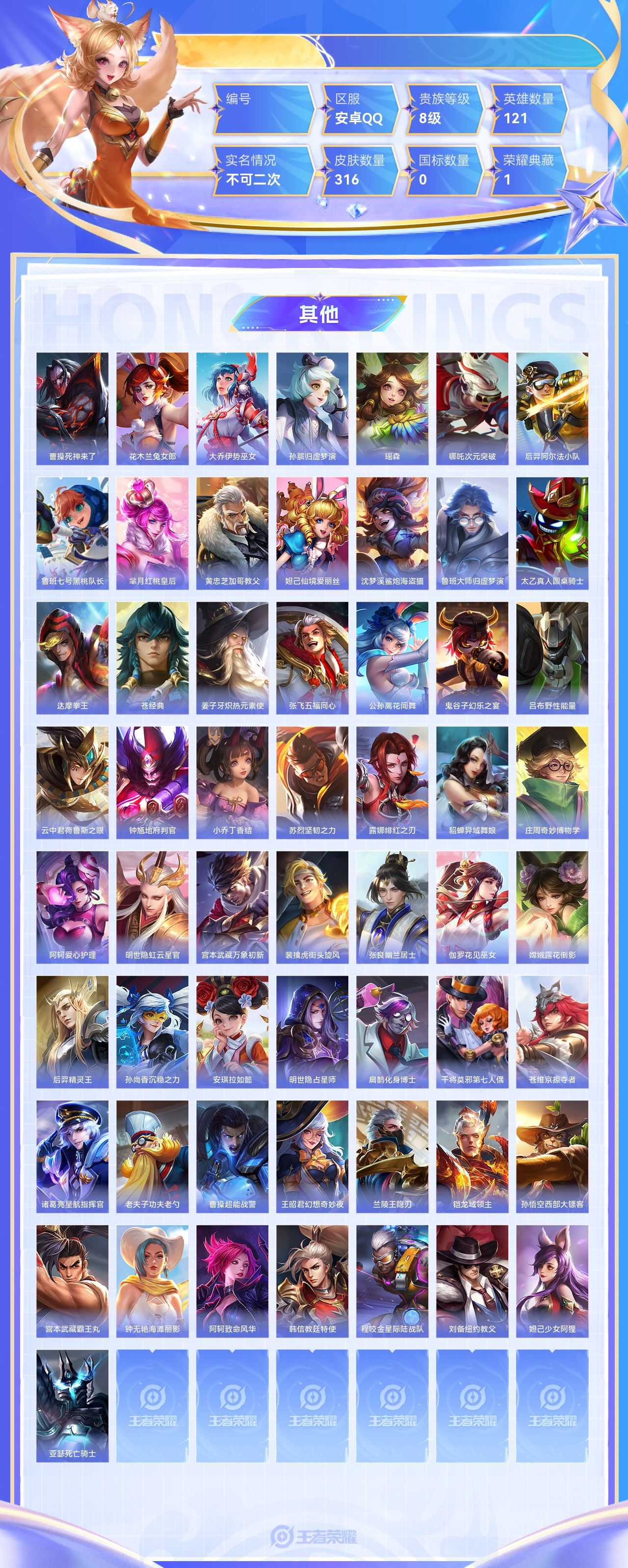 【终身找回包赔】【6X3TRCHFG】珍品传说1典藏1传说31史诗80限定109英雄121皮肤316贵族8级皮肤价值:244024 【珍品传说1】马可波罗怪盗基德 【荣耀典藏1】花木兰九霄神辉 【传说