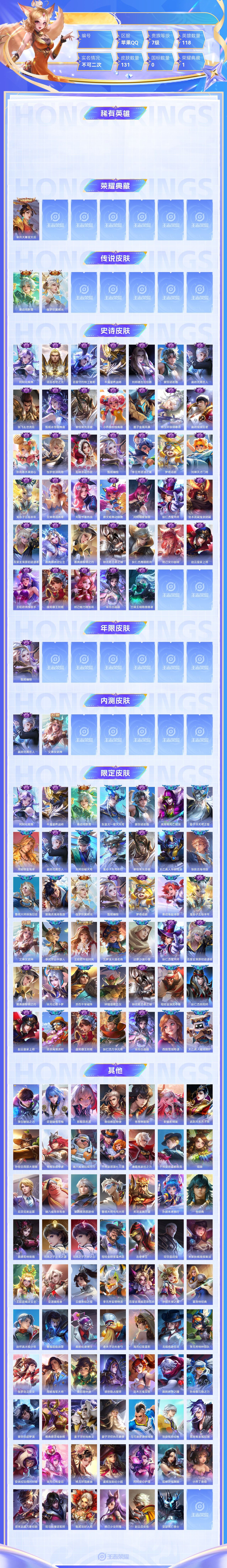 【终身找回包赔】【6TRUNEBDF】典藏1传说2史诗40限定42英雄118皮肤131稀有英雄6贵族7级皮肤价值:102340 【荣耀典藏1】芈月大秦宣太后 【传说皮肤2】桑启鸣野蒿伽罗炽翼辉光 【史