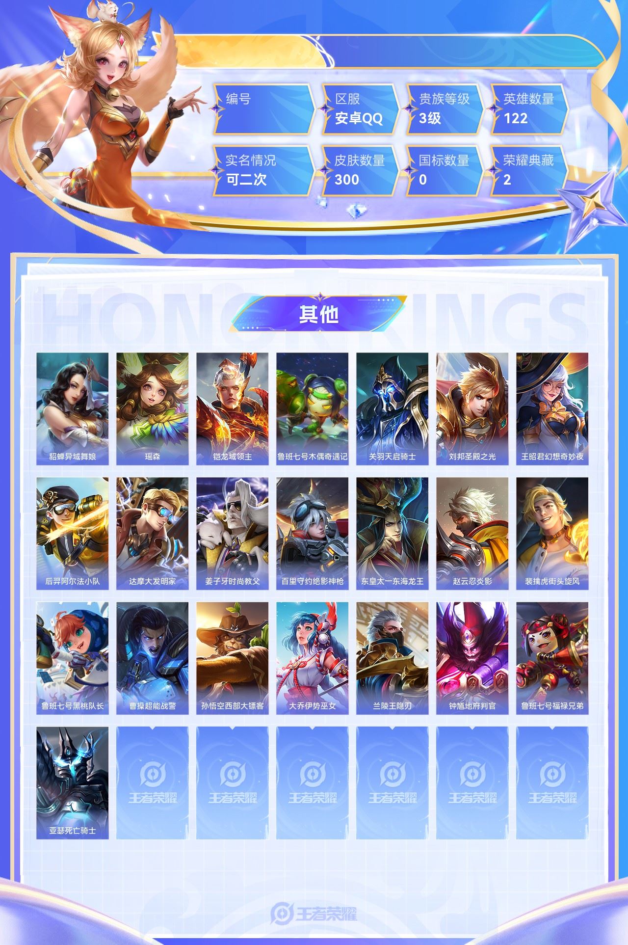 【终身找回包赔】【6TRUNDB2D】典藏2传说9史诗79限定83英雄122皮肤300稀有英雄9贵族3级皮肤价值:222460 【荣耀典藏2】孙尚香杀手不太冷孙悟空全息碎影 【传说皮肤9】桑启鸣野蒿曜