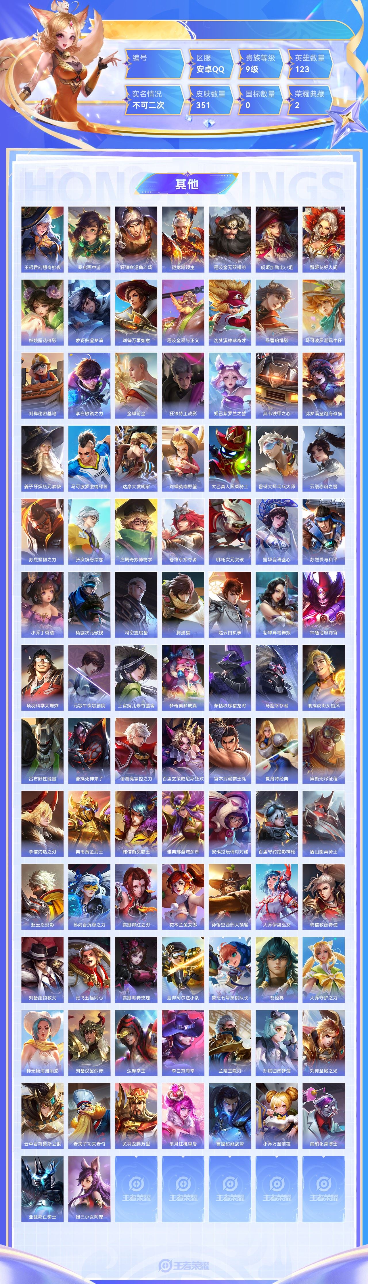【终身找回包赔】【6TRUNHGAC】典藏2传说25史诗107限定112英雄123皮肤351稀有英雄10贵族9级皮肤价值:285826 【荣耀典藏2】鲁班七号星空梦想孙悟空全息碎影 【传说皮肤25】梦