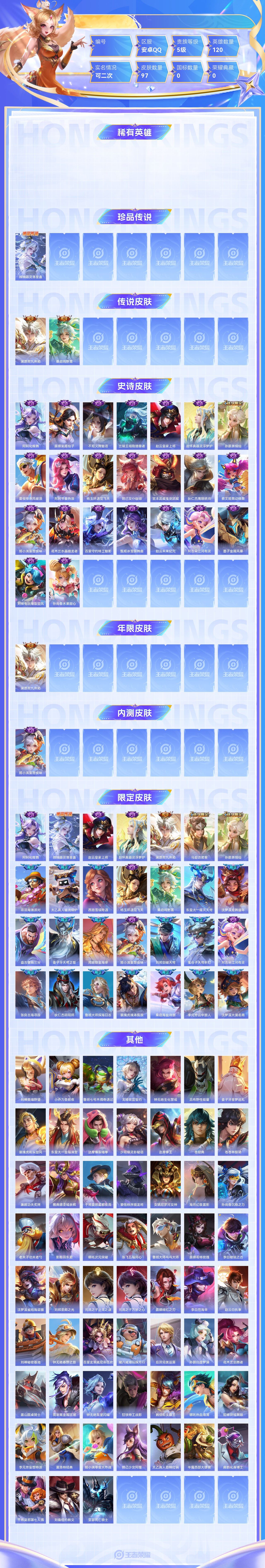 【终身找回包赔】【6JT84HBDA】珍品传说1传说2史诗23限定28英雄120皮肤97稀有英雄8贵族5级皮肤价值:55740 【珍品传说1】嫦娥器灵落星盏 【传说皮肤2】澜愿照九州拓桑启鸣野蒿 【史