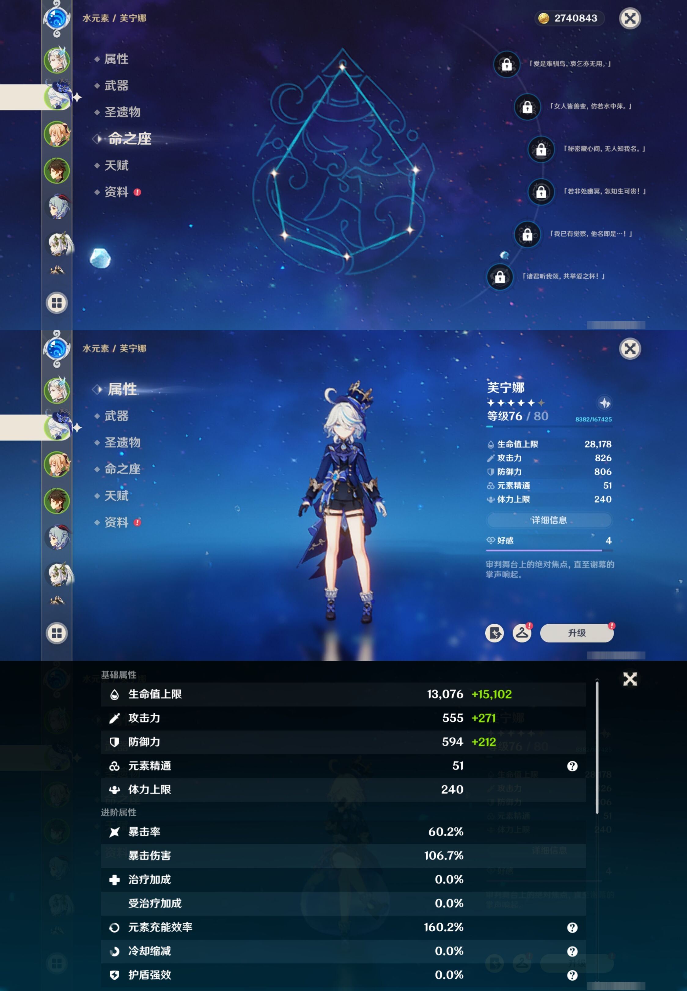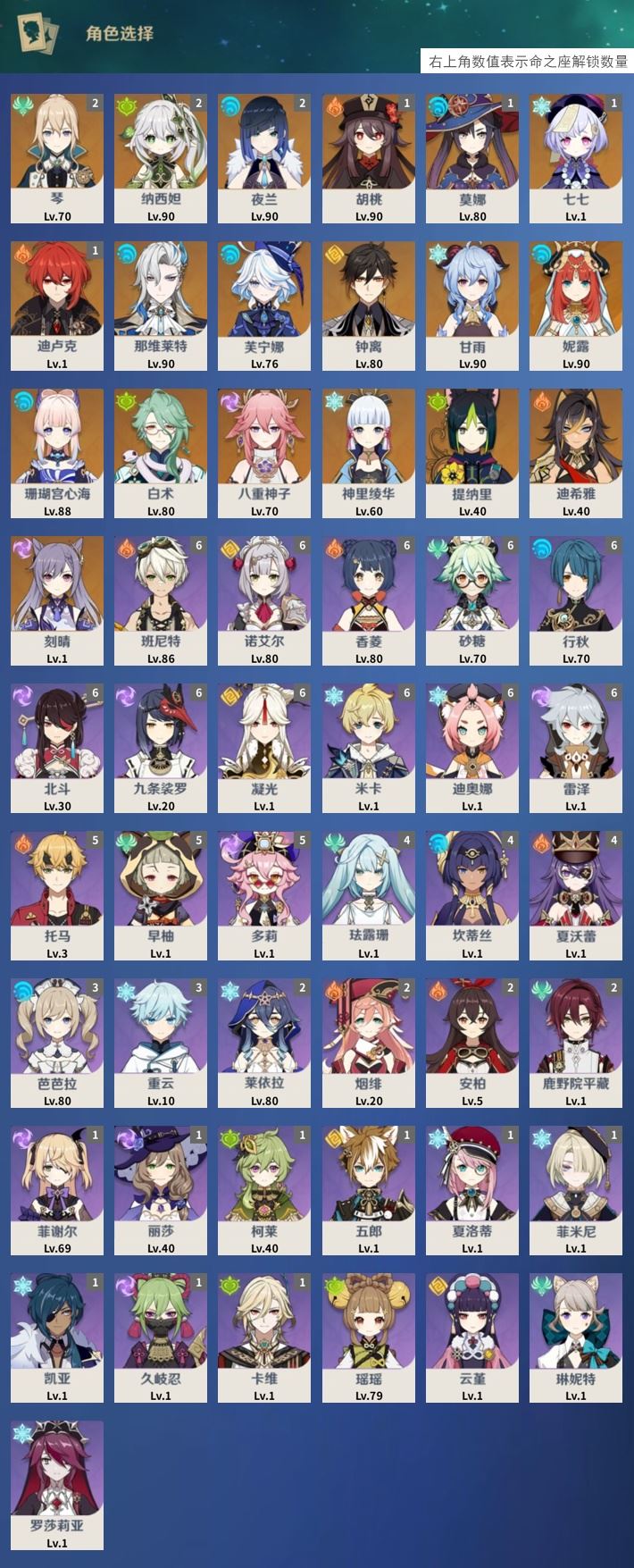 【终身找回包赔】【I698NG22B】56级,38黄,女主,19个五星角色:2命琴,2命纳西妲,2命夜兰,1命胡桃,1命莫娜,1命七七,1命迪卢克,那维莱特,芙宁娜,钟离,甘雨,妮露,珊瑚宫心海,白术