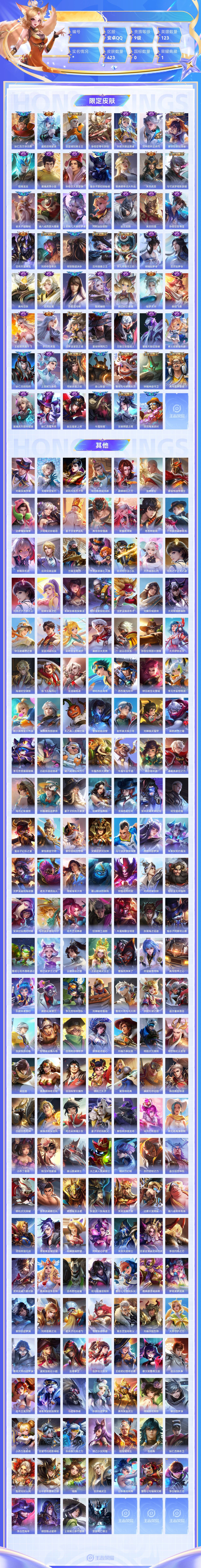 【终身找回包赔】【6JT84GCGF】典藏1传说38史诗150限定167英雄123皮肤423稀有英雄10贵族9级皮肤价值:335750 【荣耀典藏1】诸葛亮星域神启 【传说皮肤38】澜愿照九州拓司空震