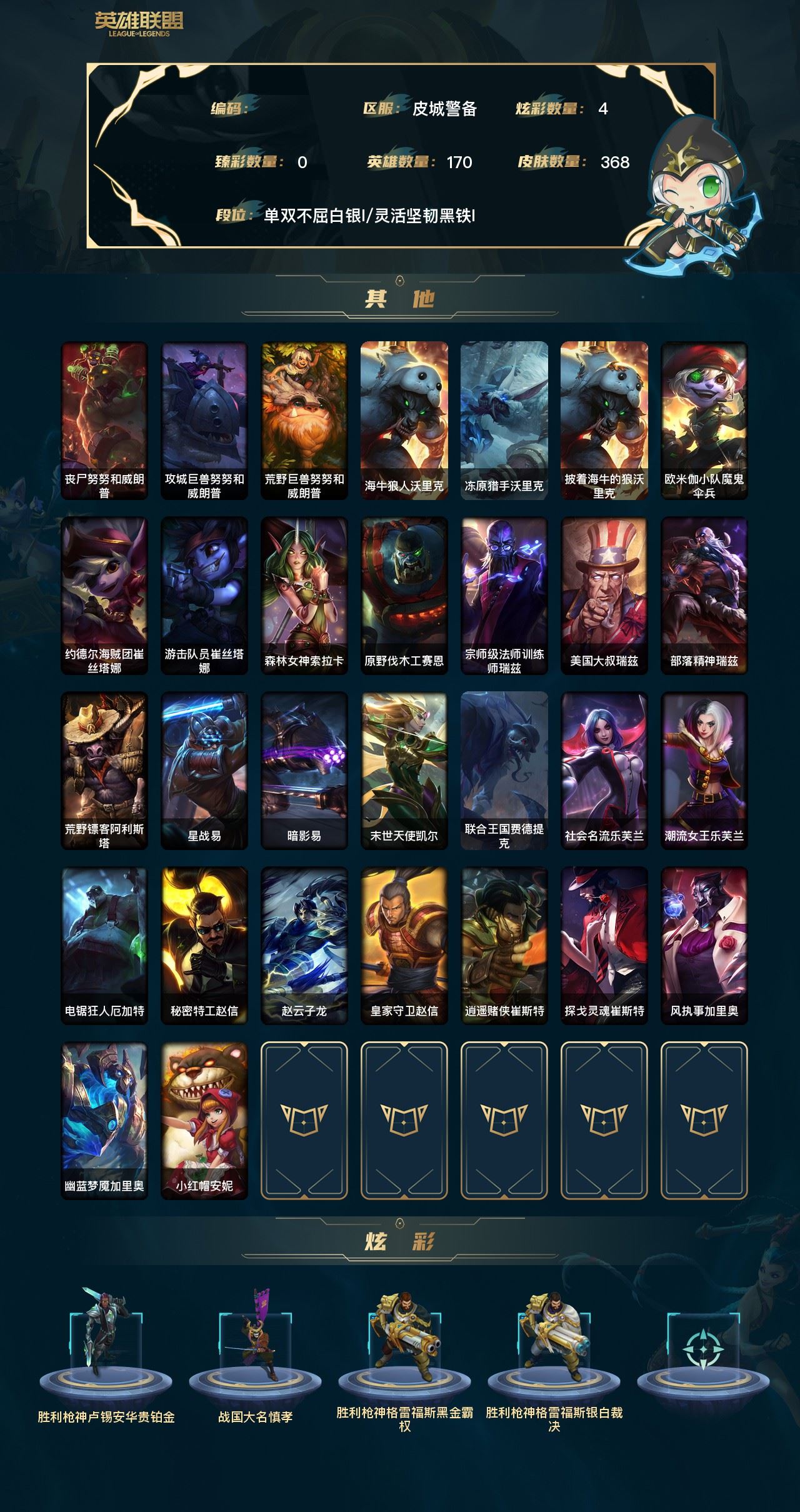 【终身找回包赔】【英雄数量170 皮肤数量0 无段位 召唤师等级0 】【I698NE1BF】170英雄/372皮肤总数(原皮+炫彩)/368皮肤/0卓越/1终极/1神话/69限定/0臻彩/4炫