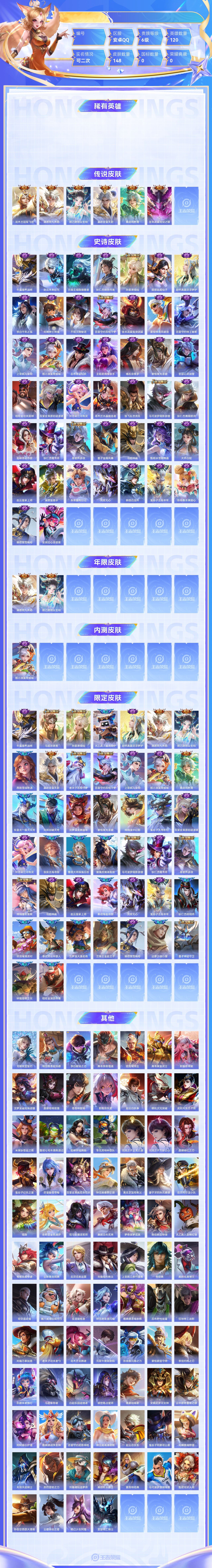 【终身找回包赔】【6SOPRAEAE】传说6史诗44限定44英雄120皮肤148稀有英雄7贵族6级皮肤价值:92716 【传说皮肤6】花木兰冠军飞将澜愿照九州拓妲己愿照众生和嬴政玄雷天君桑启鸣野蒿宫本