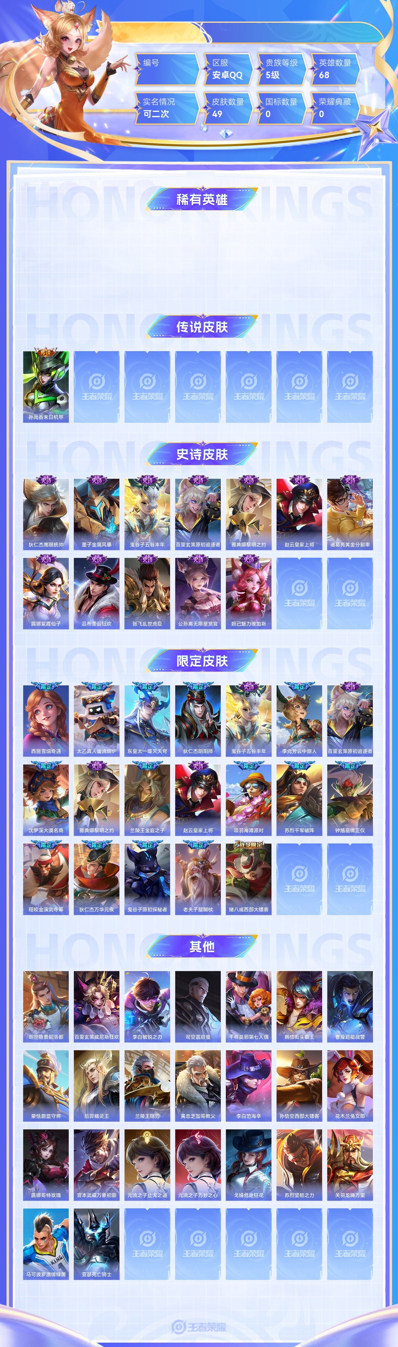 【终身找回包赔】【6XN9NC2EA】传说1史诗12限定19英雄68皮肤49稀有英雄6贵族5级皮肤价值:28012 【传说皮肤1】孙尚香末日机甲 【史诗皮肤12】狄仁杰鹰眼统帅墨子金属风暴鬼谷子五谷丰