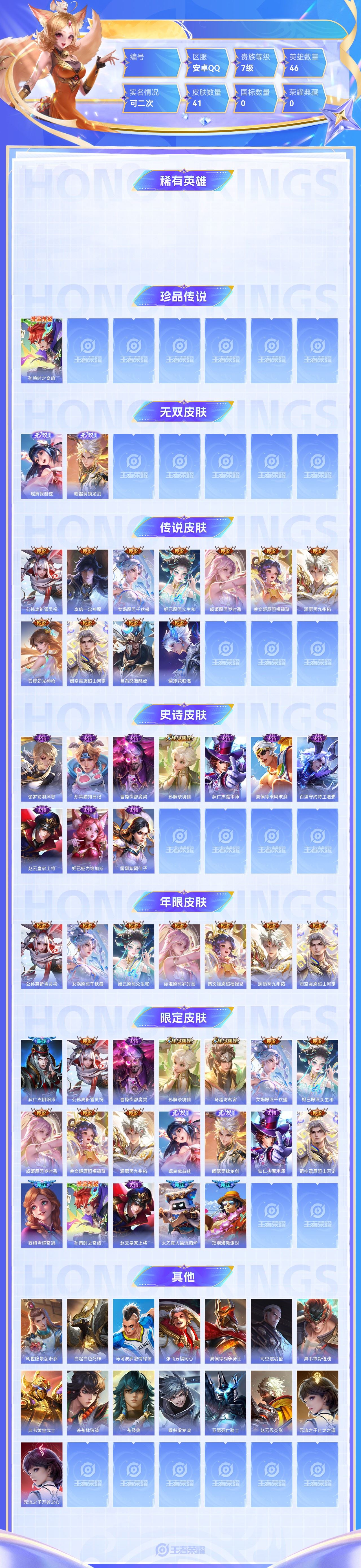 【终身找回包赔】【6XN9NFCDE】珍品传说1无双2传说11史诗10限定19英雄46皮肤41稀有英雄2贵族7级皮肤价值:36136 【珍品传说1】孙策时之奇旅 【无双皮肤2】瑶真我赫兹曜器灵螭龙剑