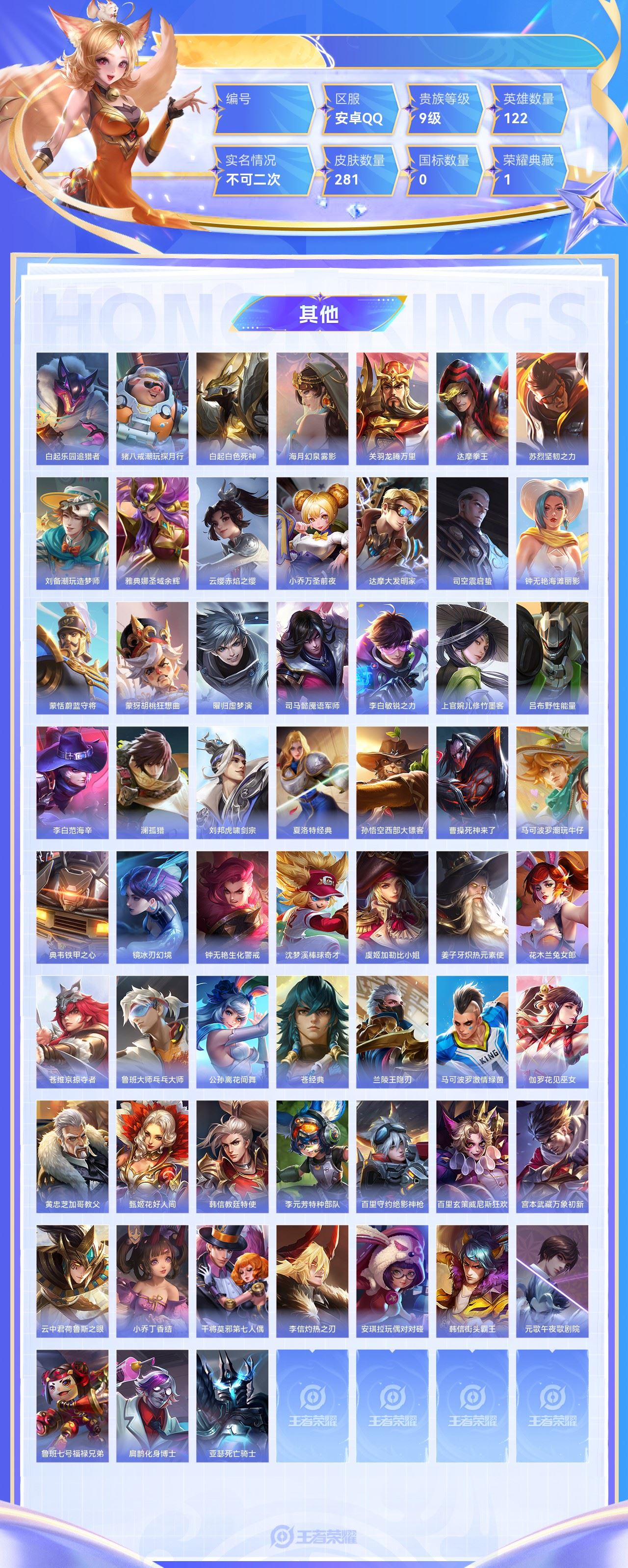 【终身找回包赔】【689X6DHBD】无双3典藏1传说41史诗99限定113英雄122皮肤281稀有英雄9贵族9级皮肤价值:254224 【无双皮肤3】曜器灵螭龙剑韩信群星魔术团李白碎月剑心 【荣耀典