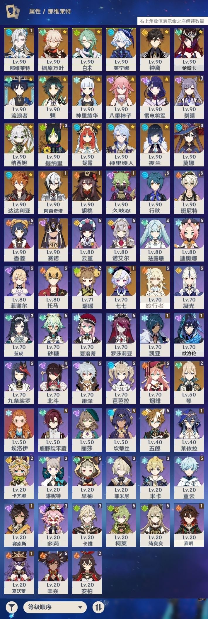 【终身找回包赔】【II7PPC2GF】60级,55黄,女主,24个五星角色:3命刻晴,3命提纳里,3命莫娜,2命琴,1命那维莱特,1命阿蕾奇诺,1命胡桃,1命七七,枫原万叶,白术,芙宁娜,钟离,恰斯卡
