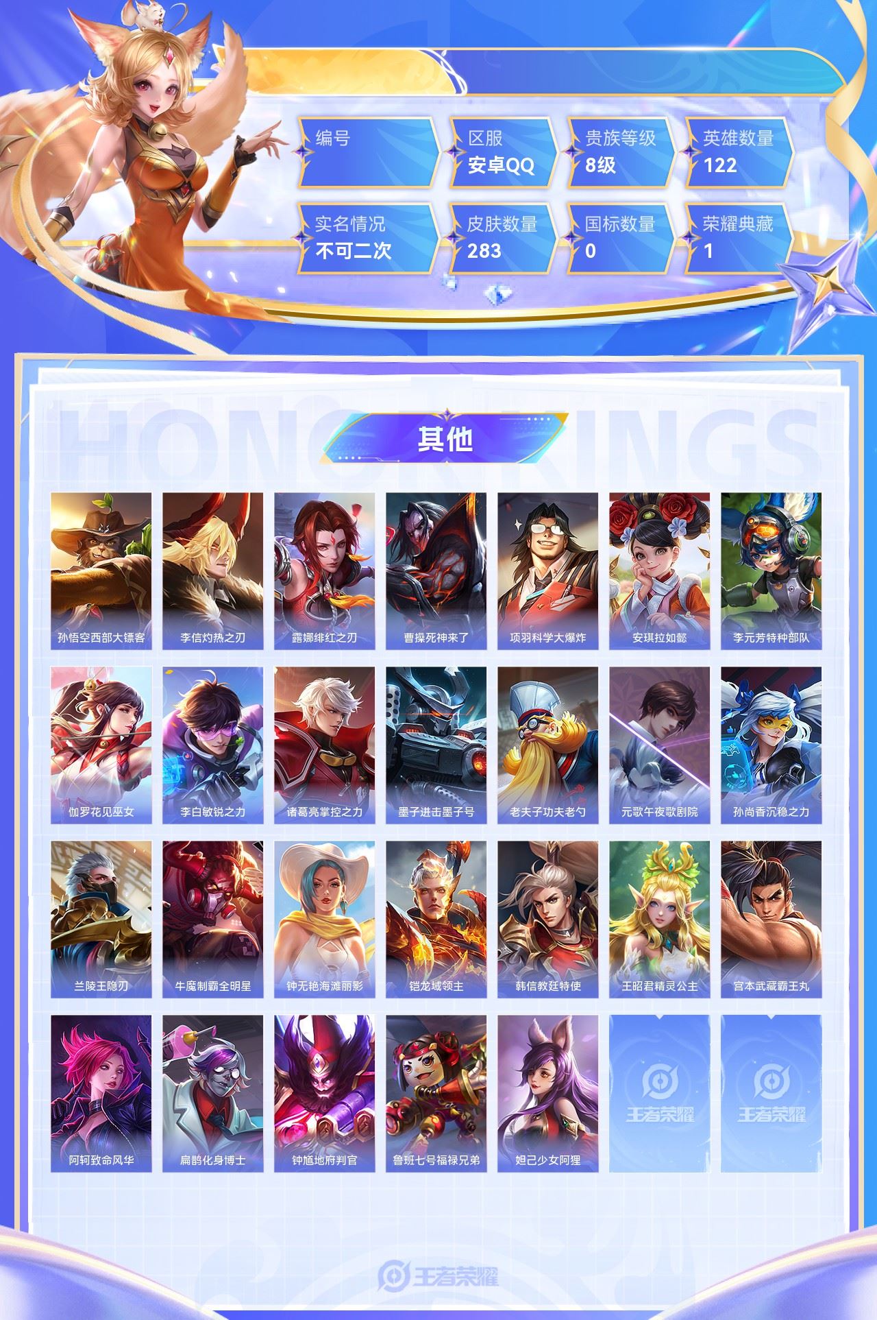 【终身找回包赔】【6Z4NRA2CB】典藏1传说9史诗86限定98英雄122皮肤283稀有英雄9贵族8级皮肤价值:200808 【荣耀典藏1】孙尚香杀手不太冷 【传说皮肤9】司空震愿照山河定桑启鸣野蒿