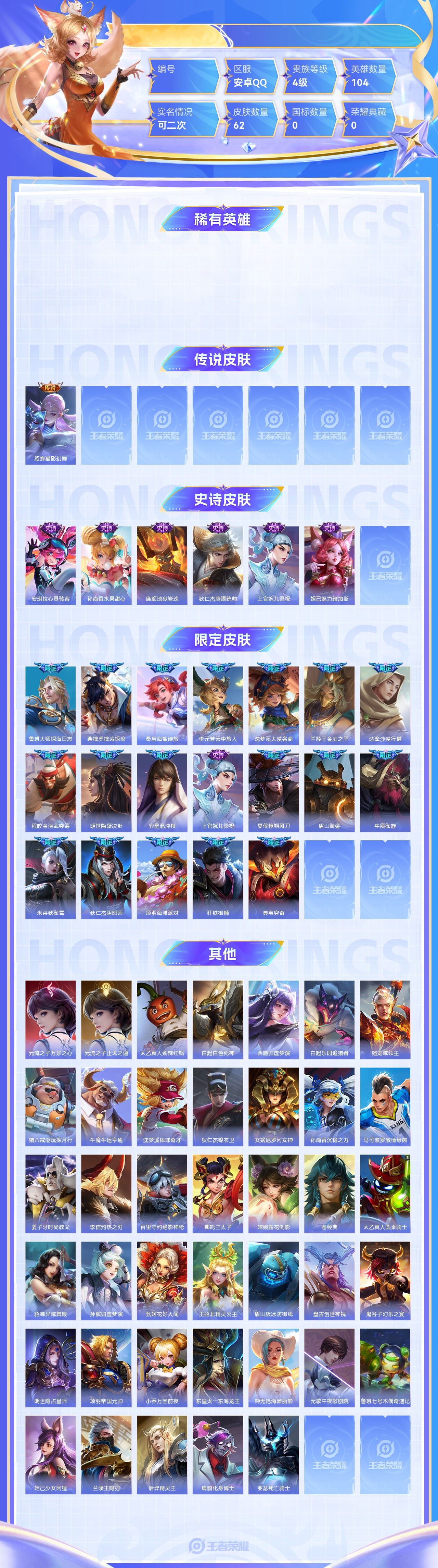 【终身找回包赔】【6TYLRFDD2】传说1史诗6限定19英雄104皮肤62稀有英雄7贵族4级皮肤价值:28856 【传说皮肤1】貂蝉猫影幻舞 【史诗皮肤6】安琪拉心灵骇客孙尚香水果甜心廉颇地狱岩魂狄