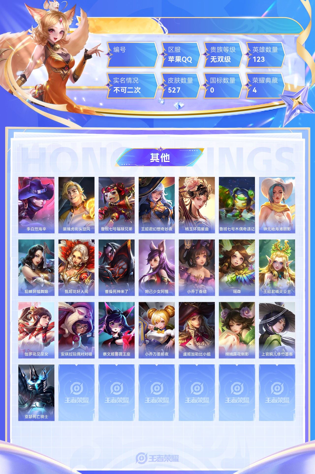 【终身找回包赔】【6WS8XDAFA】珍品传说4无双4典藏4传说85史诗182限定212英雄123皮肤527稀有英雄10贵族无双级皮肤价值:511256 【珍品传说4】嫦娥器灵落星盏孙策时之奇旅鲁班七