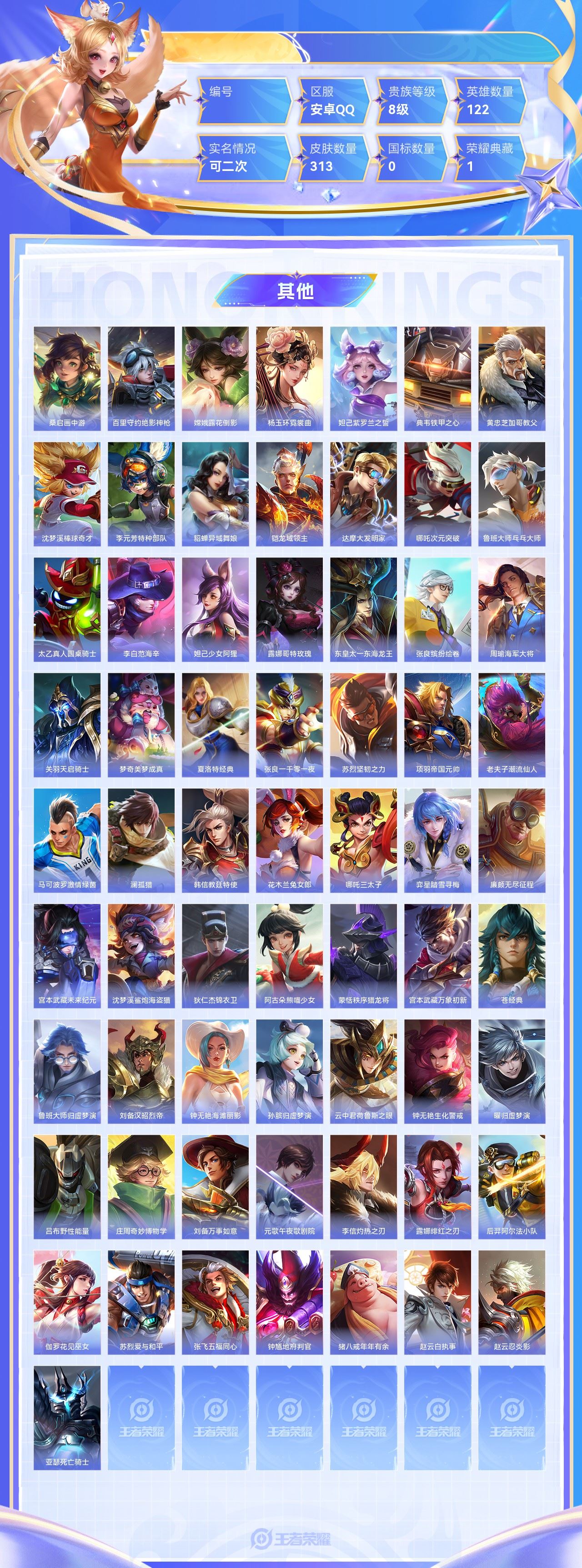 【终身找回包赔】【6WS8XDHCH】典藏1传说26史诗97限定112英雄122皮肤313稀有英雄9贵族8级皮肤价值:243898 【荣耀典藏1】花木兰九霄神辉 【传说皮肤26】西施续相思云缨幻光神枪