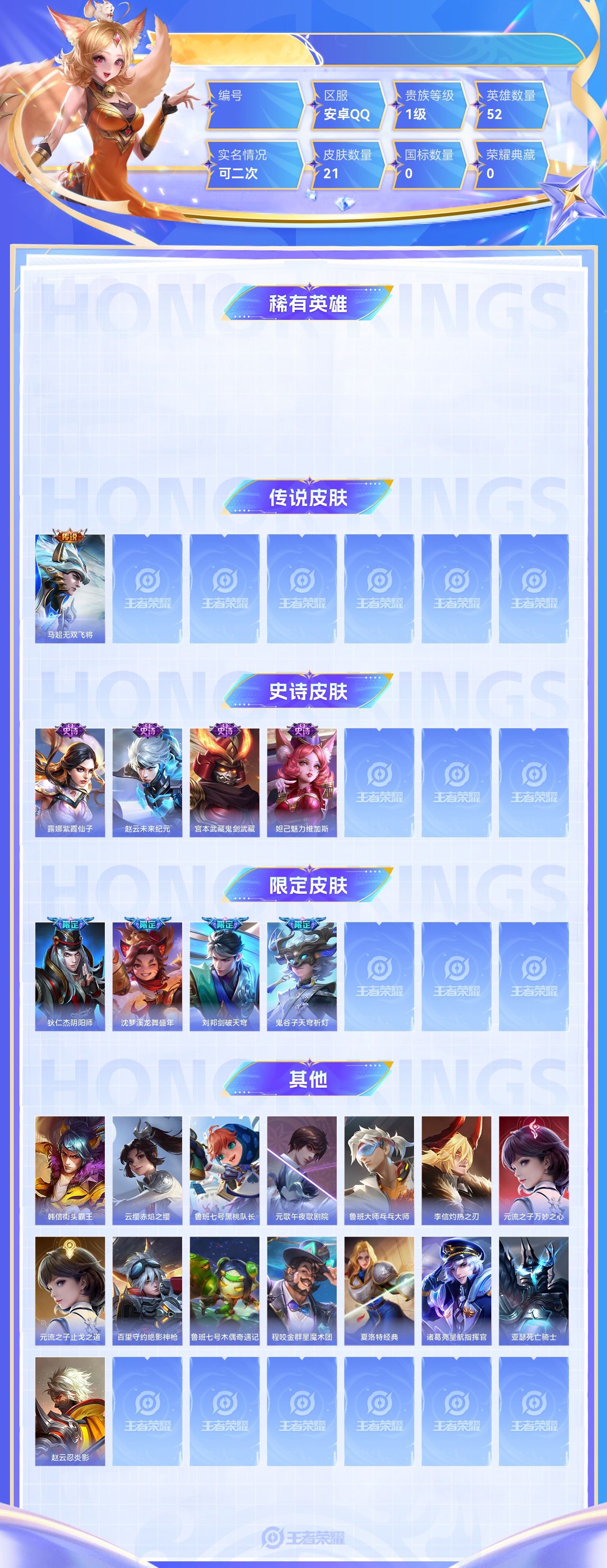 【终身找回包赔】【6SKJOEDEB】传说1史诗4限定4英雄52皮肤21稀有英雄3贵族1级皮肤价值:12648 【传说皮肤1】马超无双飞将 【史诗皮肤4】露娜紫霞仙子赵云未来纪元宫本武藏鬼剑武藏妲己魅