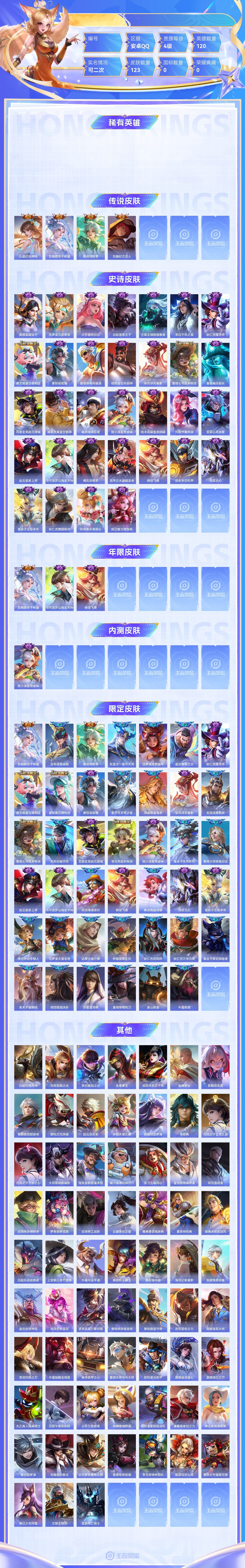 【终身找回包赔】【6SKJOH1BE】传说4史诗32限定41英雄120皮肤123稀有英雄8贵族4级皮肤价值:74288 【传说皮肤4】云缨幻光神枪女娲愿照千秋盛桑启鸣野蒿刘备时之恋人 【史诗皮肤32】