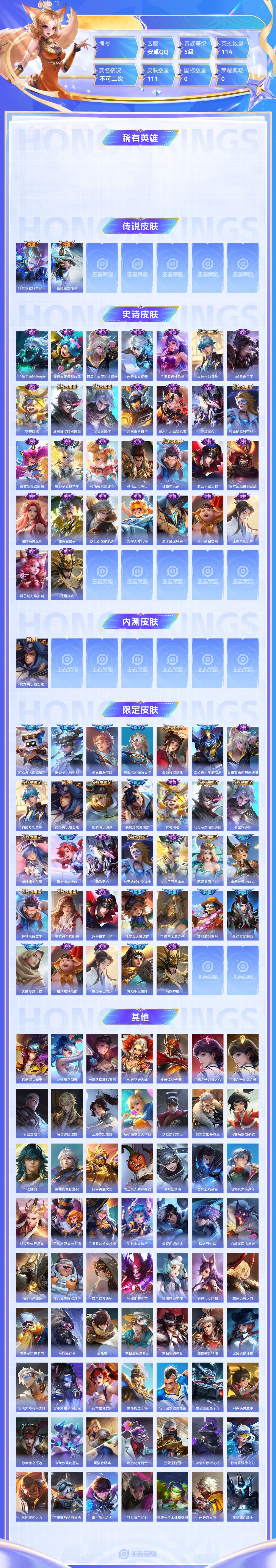 【终身找回包赔】【6VI4RDFEE】传说2史诗30限定33英雄114皮肤111稀有英雄8贵族5级皮肤价值:64140 【传说皮肤2】狄仁杰超时空战士马超无双飞将 【史诗皮肤30】兰陵王暗隐猎兽者刘禅