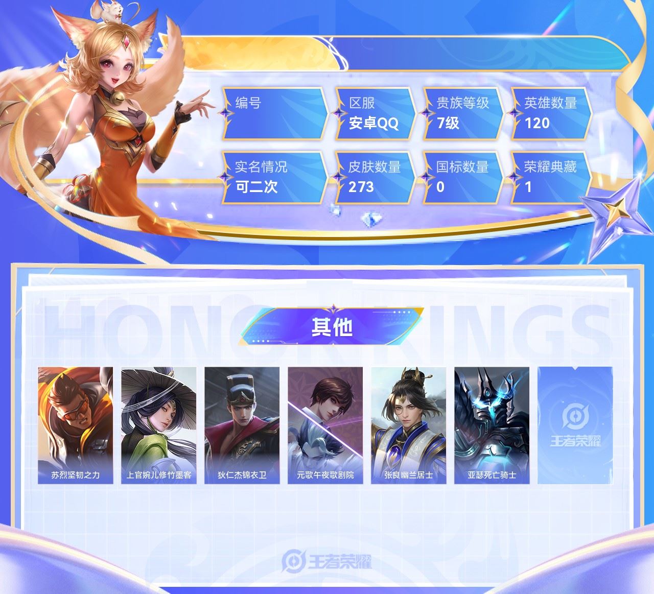 【终身找回包赔】【5级铭文数量0 召唤师等级0 白银Ⅰ 贵族V0】【终身找回包赔】【6IIZ3DDDB】典藏1传说9史诗78限定87英雄120皮肤273稀有英雄8贵族7级皮肤价值:187016 【荣耀典藏1】貂蝉幻阙歌 【传说皮肤9】桑启鸣野蒿李白诗剑行曜李逍遥曜云