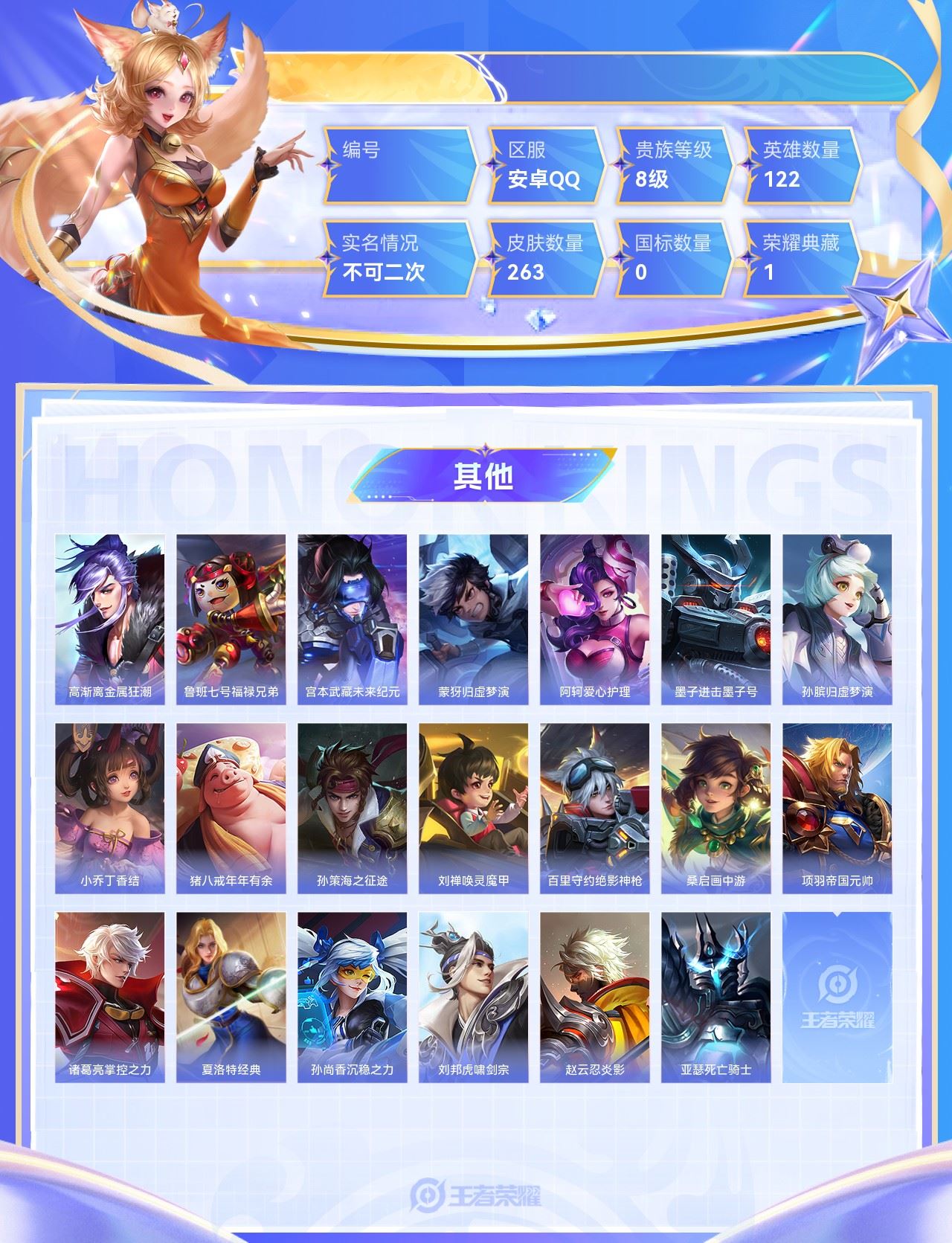 【终身找回包赔】【6V6X4GGEC】珍品传说1无双1典藏1传说23史诗74限定76英雄122皮肤263稀有英雄9贵族8级皮肤价值:197324 【珍品传说1】马可波罗怪盗基德 【无双皮肤1】韩信群星