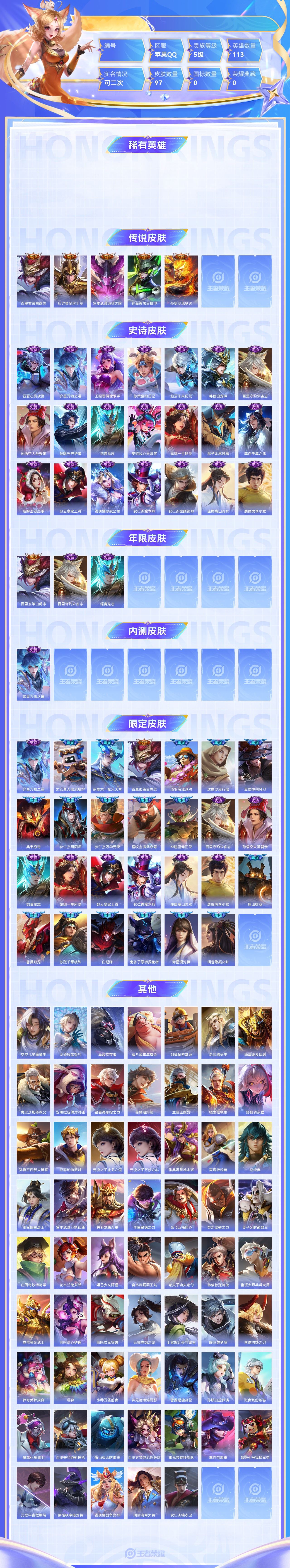 【终身找回包赔】【63PXSGCBD】传说5史诗21限定27英雄113皮肤97稀有英雄8贵族5级皮肤价值:56180 【传说皮肤5】百里玄策白虎志后羿黄金射手座宫本武藏地狱之眼孙尚香末日机甲孙悟空地狱