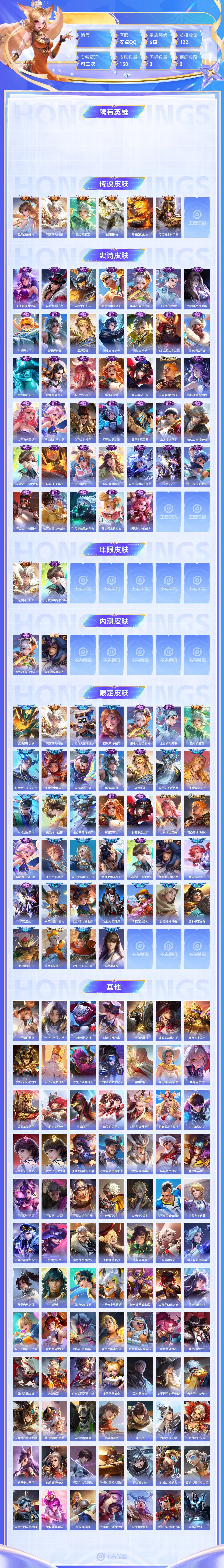 【终身找回包赔】【63PXSBAEB】传说6史诗40限定39英雄122皮肤150稀有英雄9贵族6级皮肤价值:91864 【传说皮肤6】云缨幻光神枪澜愿照九州拓桑启鸣野蒿镜炽阳神光孙悟空地狱火后羿黄金射