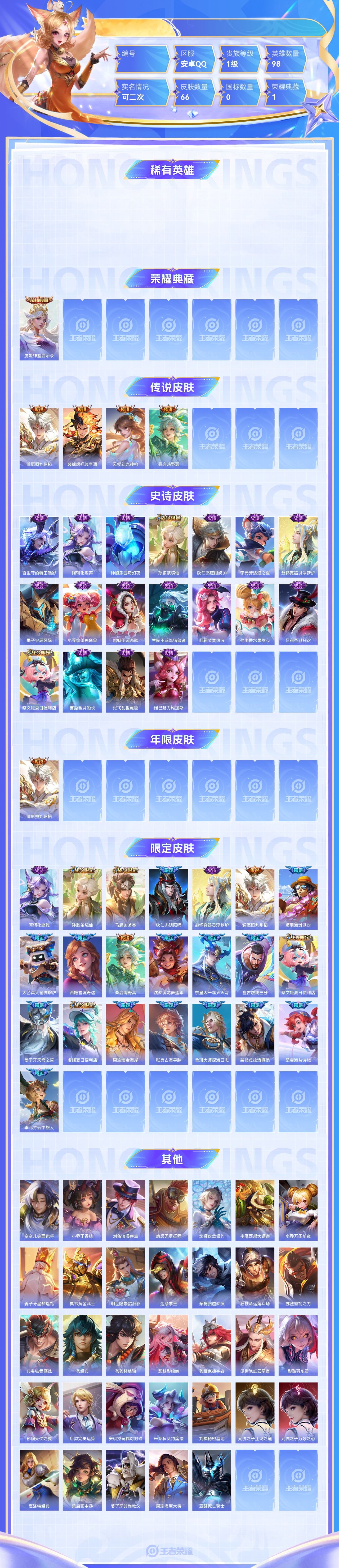 【终身找回包赔】【63PXS1H1A】典藏1传说4史诗18限定22英雄98皮肤66稀有英雄3贵族1级皮肤价值:62520 【荣耀典藏1】虞姬神鉴启示录 【传说皮肤4】澜愿照九州拓裴擒虎祥瑞亨通云缨幻光