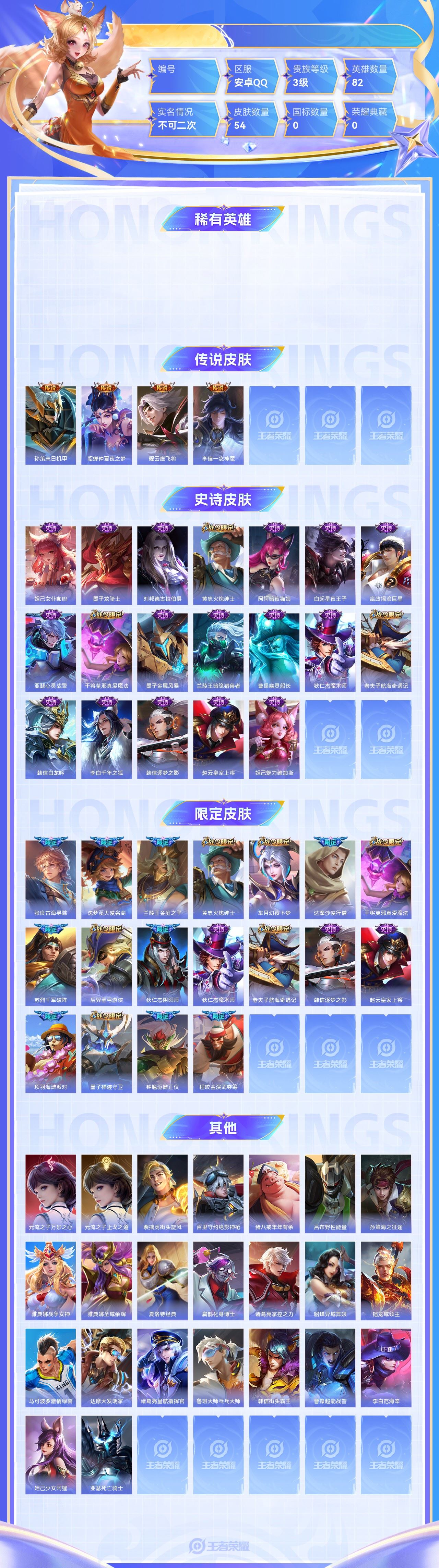 【终身找回包赔】【6N77J2HGB】传说4史诗19限定18英雄82皮肤54稀有英雄7贵族3级皮肤价值:41174 【传说皮肤4】孙策末日机甲貂蝉仲夏夜之梦曜云鹰飞将李信一念神魔 【史诗皮肤19】妲己