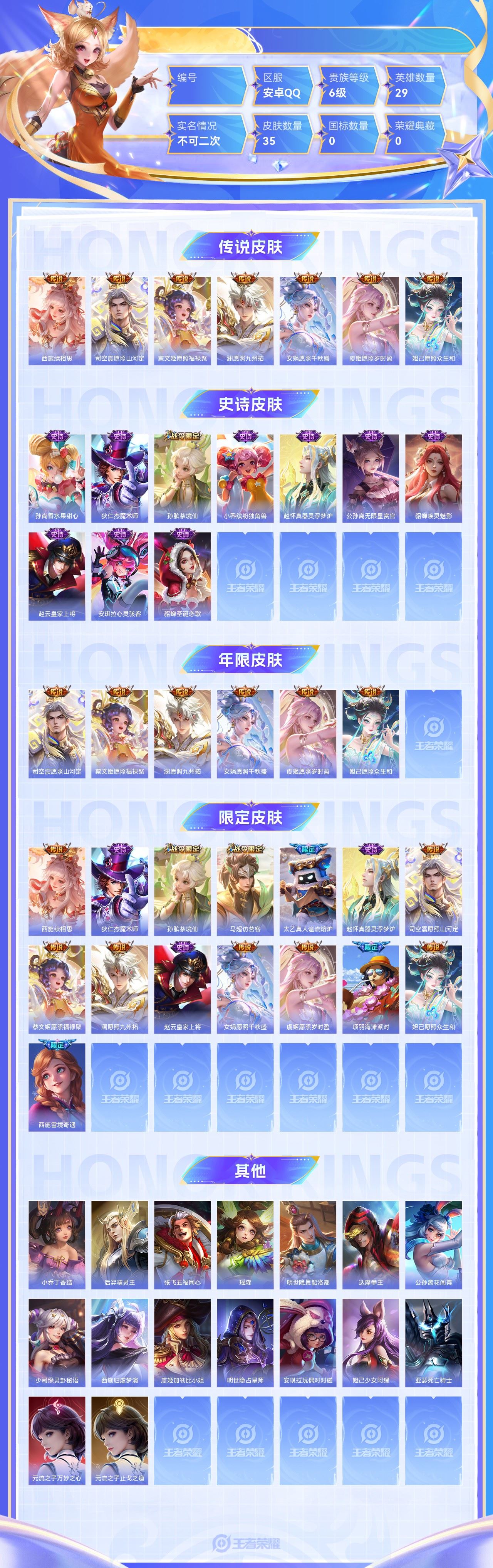 【终身找回包赔】【6WTLOECA2】传说7史诗10限定15英雄29皮肤35贵族6级皮肤价值:28680 【传说皮肤7】西施续相思司空震愿照山河定蔡文姬愿照福禄聚澜愿照九州拓女娲愿照千秋盛虞姬愿照岁时