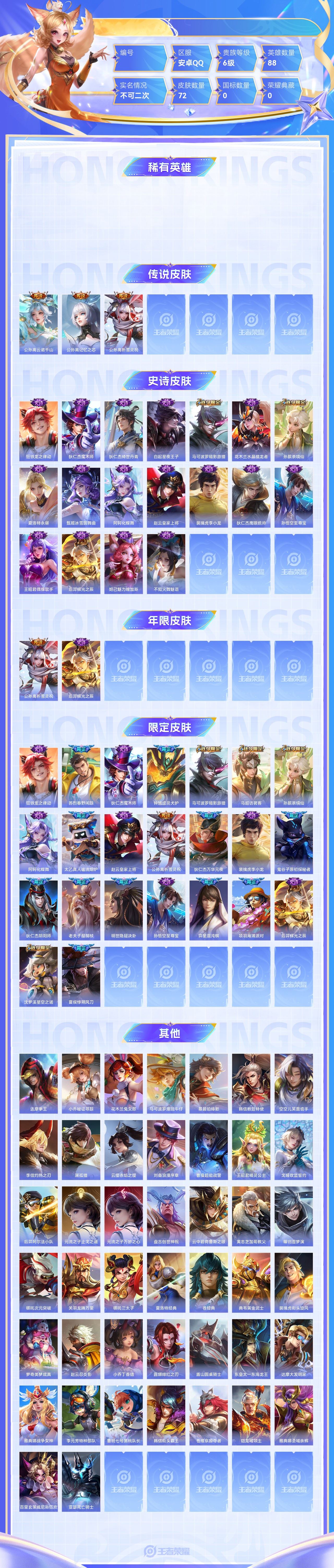【终身找回包赔】【6WTLOF2GC】传说3史诗18限定23英雄88皮肤72稀有英雄7贵族6级皮肤价值:43736 【传说皮肤3】公孙离云诺千山公孙离记忆之芯公孙离祈雪灵祝 【史诗皮肤18】狂铁龙之律