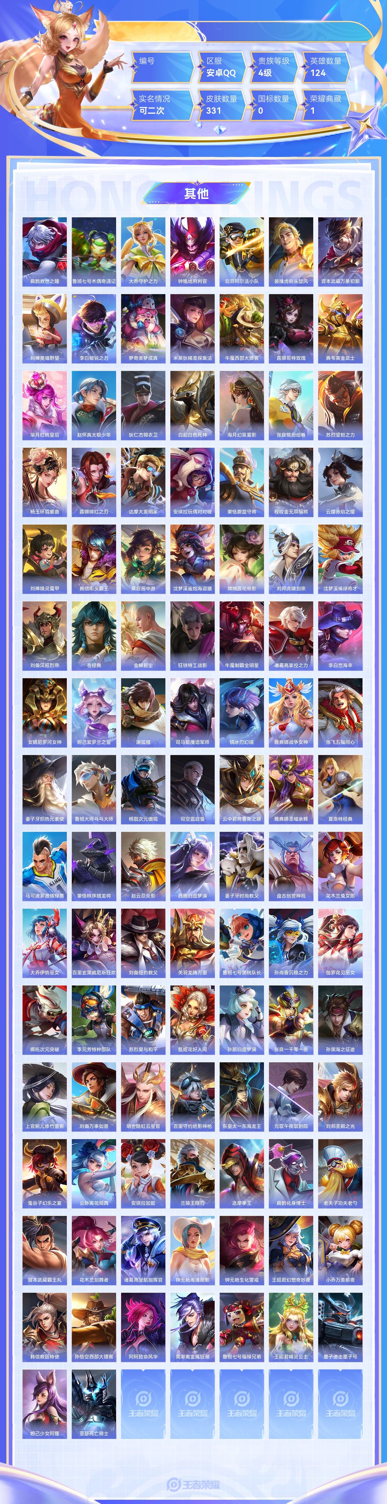【终身找回包赔】【6KXIXFH2D】珍品传说1无双1典藏1传说26史诗87限定107英雄124皮肤331稀有英雄10贵族4级皮肤价值:247184 【珍品传说1】嫦娥器灵落星盏 【无双皮肤1】妲己青