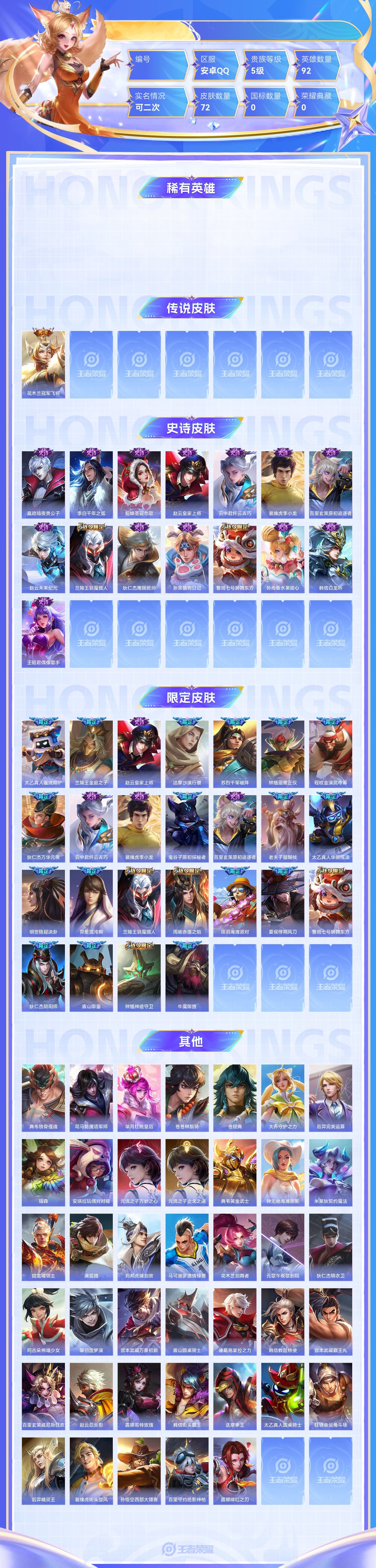 【终身找回包赔】【5级铭文数量0 召唤师等级0 白银Ⅰ 贵族V0】【终身找回包赔】【68L5TF1FF】传说1史诗15限定25英雄92皮肤72稀有英雄5贵族5级皮肤价值:38808 【传说皮肤1】花木兰冠军飞将 【史诗皮肤15】嬴政暗夜贵公子李白千年之狐貂蝉圣诞恋歌