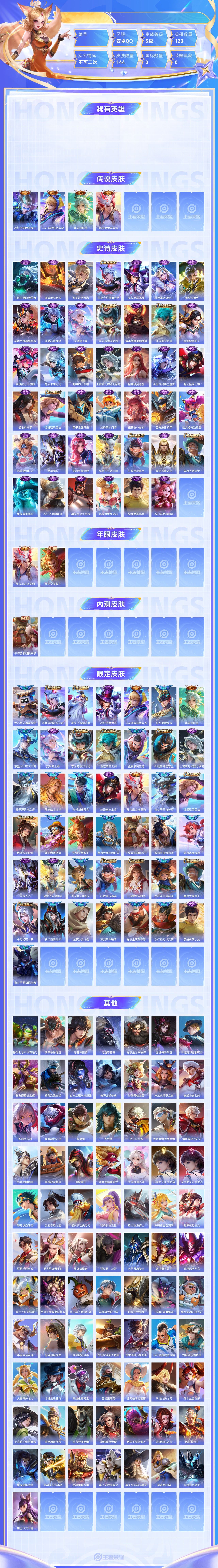 【终身找回包赔】【5级铭文数量0 召唤师等级0 白银Ⅰ 贵族V0】【终身找回包赔】【68L5THF22】传说4史诗41限定43英雄120皮肤144稀有英雄8贵族5级皮肤价值:90872 【传说皮肤4】狄仁杰超时空战士马可波罗妄想实况桑启鸣野蒿孙策乘龙淬吴钩 【史诗皮