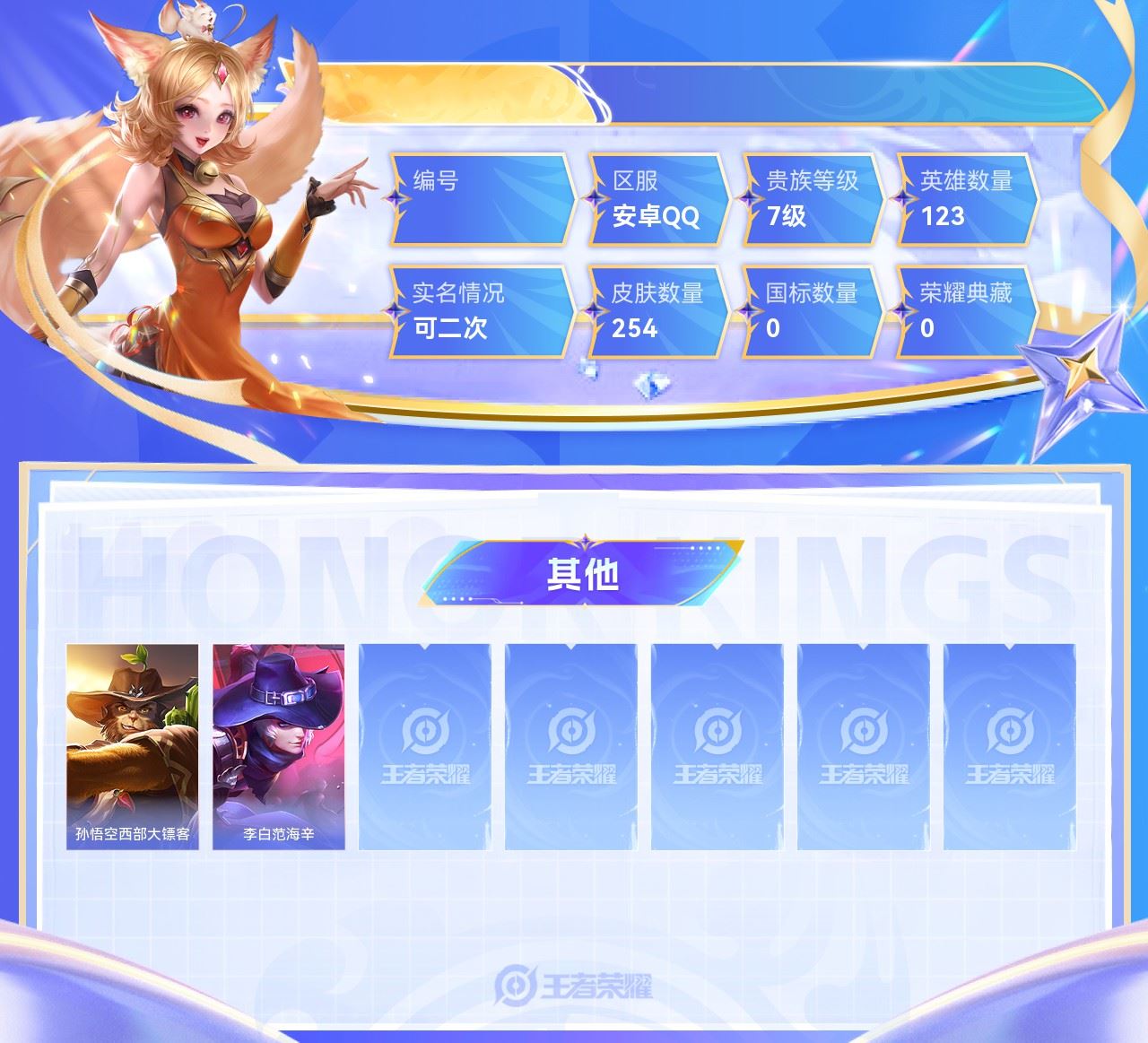 【终身找回包赔】【5级铭文数量0 召唤师等级0 白银Ⅰ 贵族V0】【终身找回包赔】【68L5TACDG】无双1传说13史诗85限定87英雄123皮肤254稀有英雄9贵族7级皮肤价值:165244 【无双皮肤1】曜器灵螭龙剑 【传说皮肤13】狄仁杰超时空战士虞姬启明星