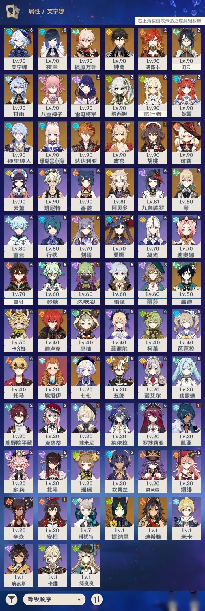 【终身找回包赔】【I698N2C2D】60级,100黄,女主,26个五星角色:满命芙宁娜,满命夜兰,满命七七,5命刻晴,4命可莉,4命莫娜,3命琴,2命玛薇卡,2命闲云,2命雷电将军,2命纳西妲,2命