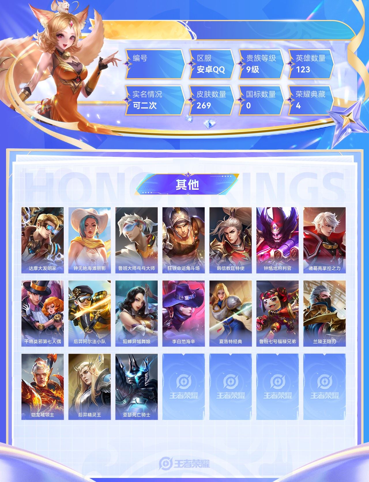 【终身找回包赔】【6SUY91EHA】无双1典藏4传说29史诗76限定75英雄123皮肤269稀有英雄10贵族9级皮肤价值:270556 【无双皮肤1】武则天神器明辉仪 【荣耀典藏4】貂蝉幻阙歌铠银白