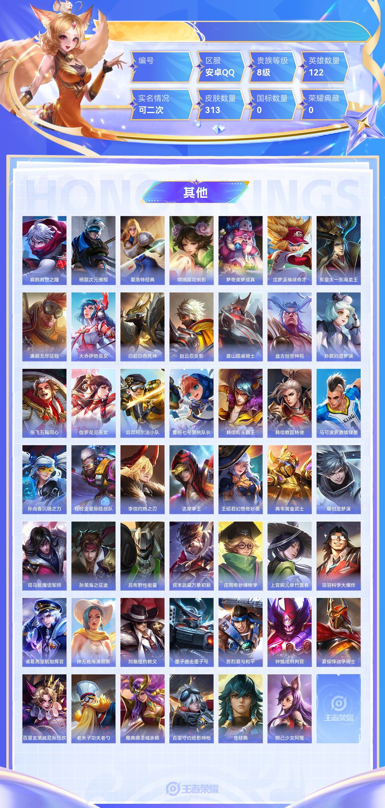 【终身找回包赔】【6JWW5ABCE】传说34史诗92限定100英雄122皮肤313稀有英雄9贵族8级皮肤价值:225246 【传说皮肤34】桑启鸣野蒿娜可露露前尘镜橘右京枫霜尽亚连落雪白狼吕布曦玄引