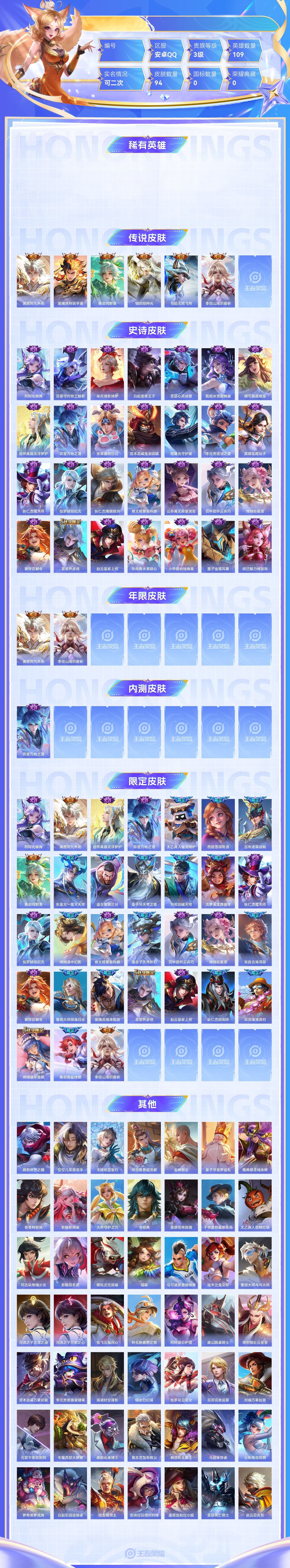 【终身找回包赔】【69OX6EEAA】传说6史诗28限定31英雄109皮肤94稀有英雄7贵族3级皮肤价值:71156 【传说皮肤6】澜愿照九州拓裴擒虎祥瑞亨通桑启鸣野蒿镜炽阳神光马超无双飞将李信山海炽