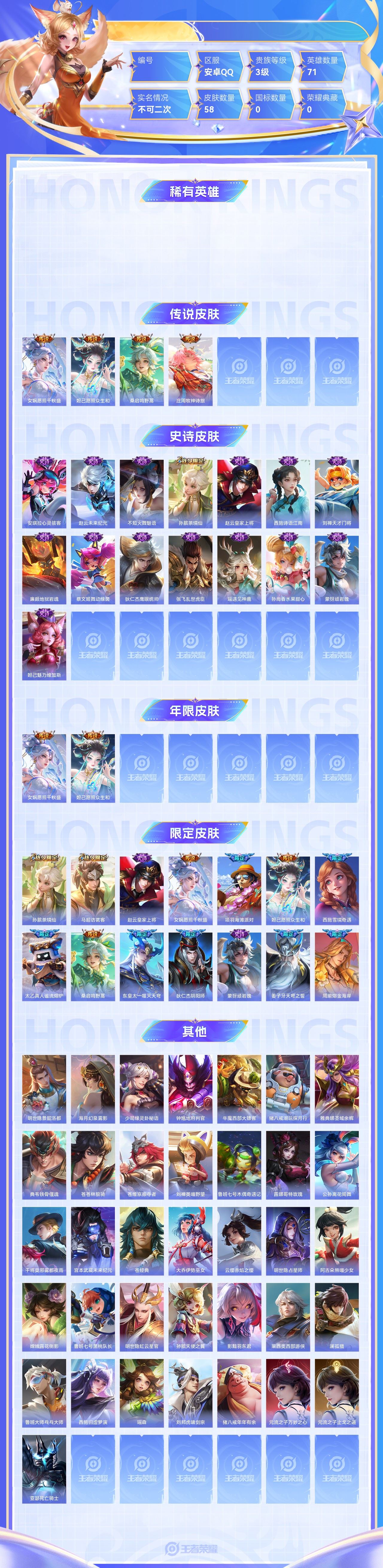 【终身找回包赔】【6WYWUFEFH】传说4史诗15限定14英雄71皮肤58稀有英雄2贵族3级皮肤价值:36704 【传说皮肤4】女娲愿照千秋盛妲己愿照众生和桑启鸣野蒿庄周牧神诗旅 【史诗皮肤15】安