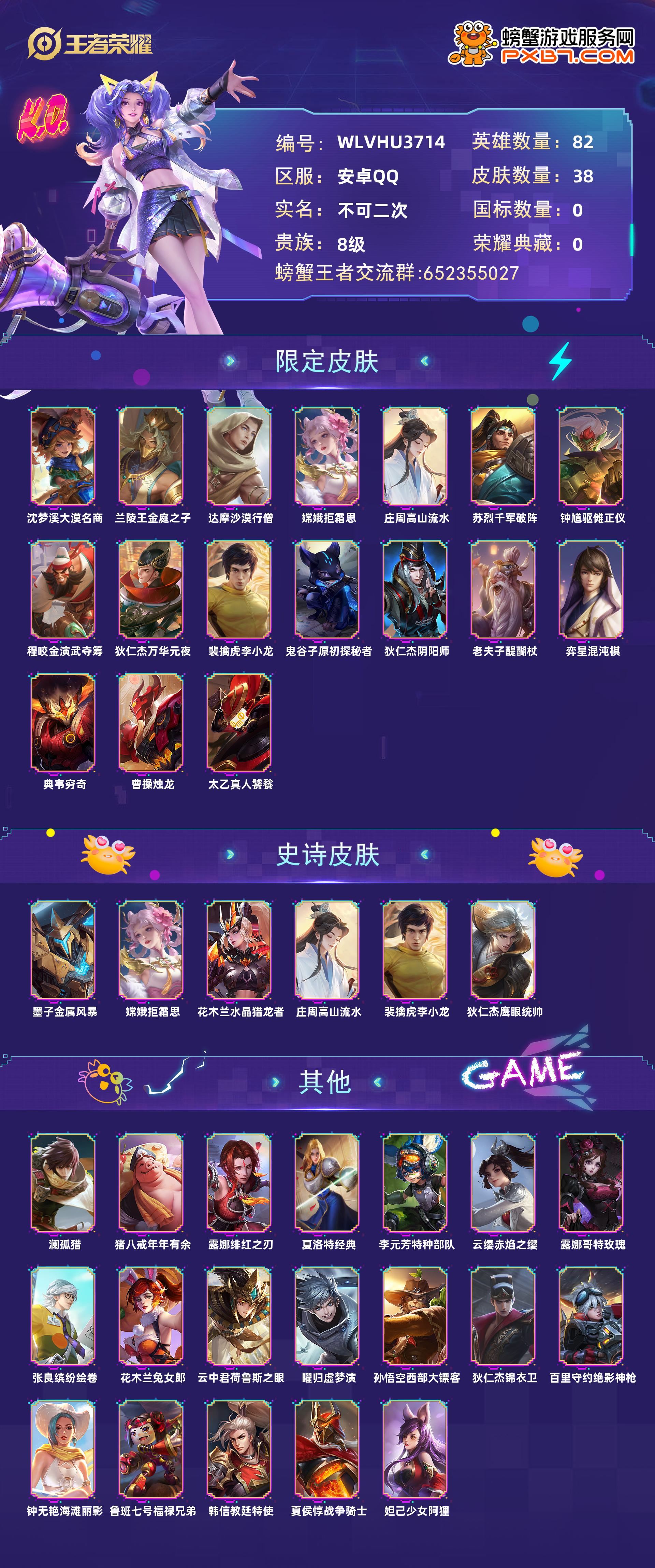 【终身找回包赔】【63K0LFCGE】限定17史诗6英雄82皮肤38贵族8级皮肤价值:27756可排位 【限定皮肤17】沈梦溪大漠名商兰陵王金庭之子达摩沙漠行僧嫦娥拒霜思庄周高山流水苏烈千军破阵钟馗驱